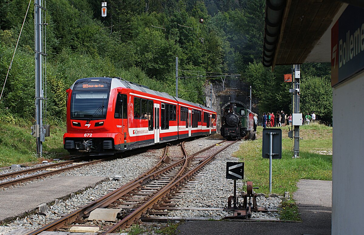 CJ Chemins de fer du Jura La Traction: ABe 4/12 672 (Stadler AG 2024), Zug 238 Glovelier-La Chaux-de-Fonds, und G 3/4 14 "Madlaina" + J 316 + WR 777 + BR 779, private Veranstaltung mit Verpflegung und Zugüberfall, Bollement, 23. August 2025.