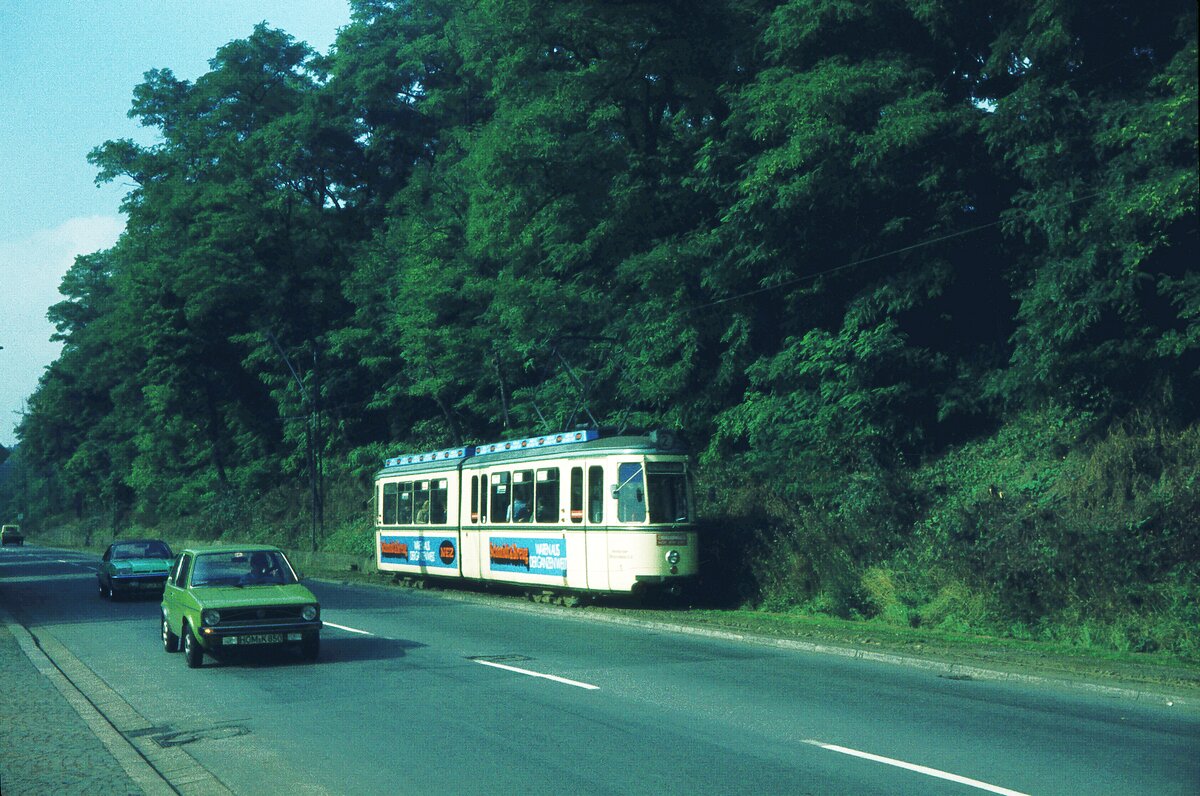 SSB Stuttgart__Zahnradbahn__Tw 103 [ME 1937] auf der (für die 1982 in Betrieb zu nehmenden ZT4.1) neuen und jetzt doppelt so langen Schiebebühne im Betriebshof. Tw 103 hatte erst vor ein paar Monate neue Zahnräder bekommen, die aber zu laut klapperten..._02.06.1981