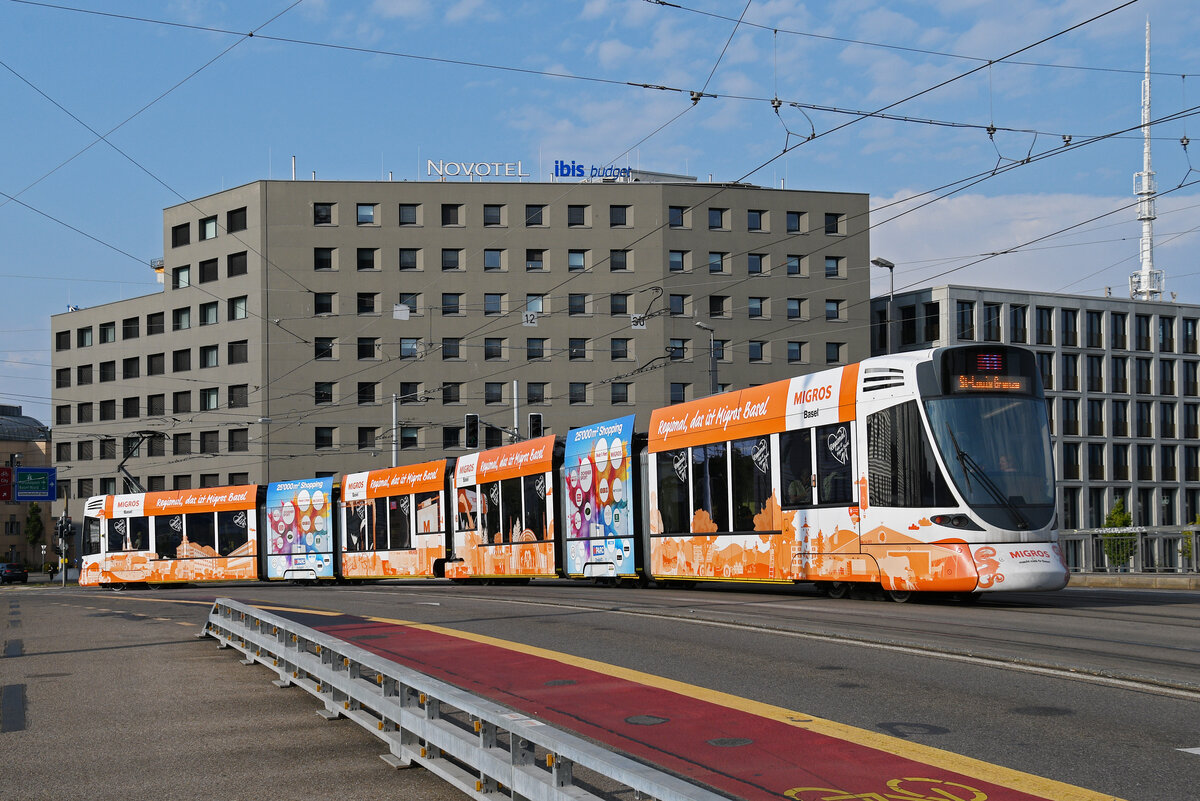 Be 6/10 Tango 177 mit der Migros Werbung, auf der Linie 11, überquert am16.08.2025 die Münchensteinerbrücke. Aufnahme Basel.