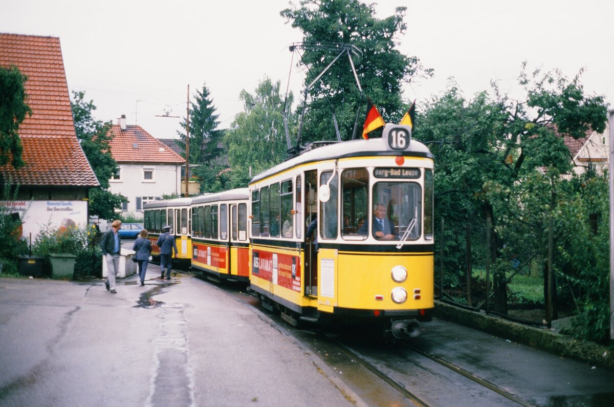 Gerlinger Endstation der Straßenbahn: Bei dieser Sonderfahrt der SSB "stauten" sich sozusagen die regulären und historischen Straßenbahnwagen in Gerlingen. Sie mussten daher die straßenbahnschleife in ihrer vollen Stationslänge nutzen. TW 802 (MF Esslingen Serie T2) und zwei Beiwagen der Serie B2 versperrten den regulären Zügen die Durchfahrt (es könnte 1988 gewesen sein).