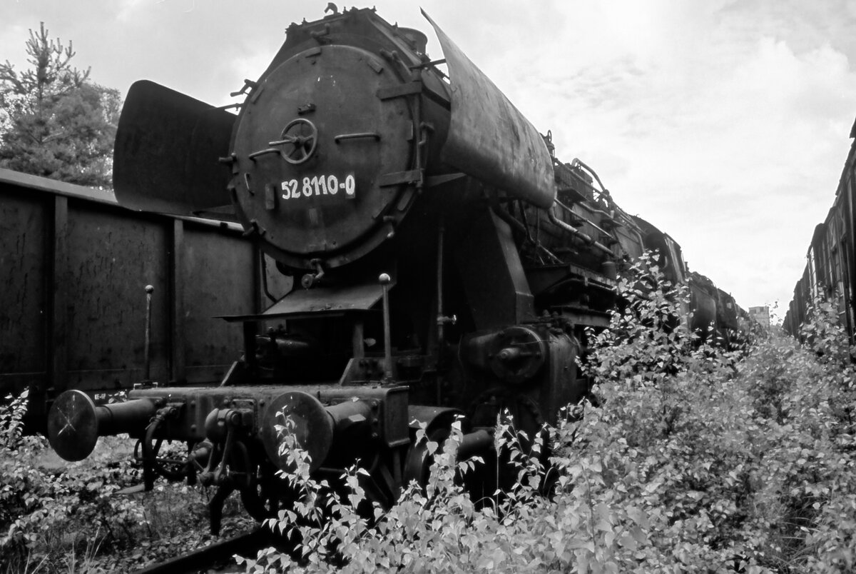 In einem wild zugewachsenen Gelände in Halbendorf standen am 29.07.1991 zahlreiche ausgemusterte Damfplok, darunter auch die DR-Rekolok 52 8110