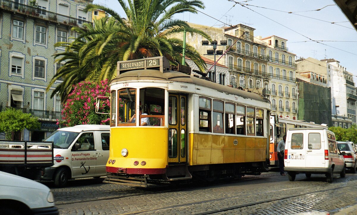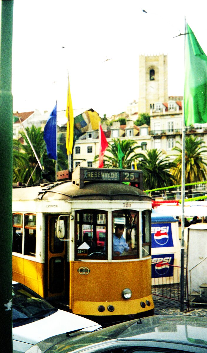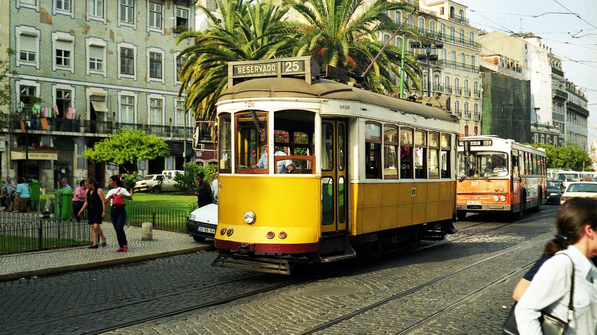 Lissabon Elétricos__Tw 720 auf Linie 25, mit Volvo  Standard-Bus  in Lissabons Unterstadt, der Baixa.__06-1999