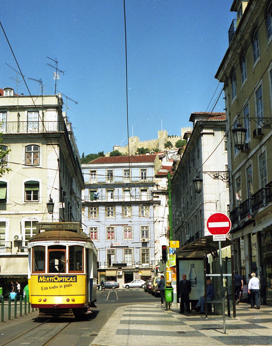 Lissabon Elétricos__Tw 566 auf Linie 12, in Lissabons Unterstadt, der Baixa. Im Hintergrund das Castelo de São Jorge.__06-1999