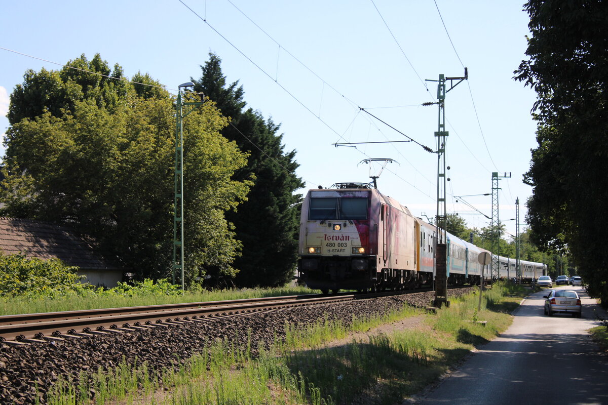 MÁV-START 480 003  Szent István király  mit dem Ex 15606  Ezüstpart  von Fonyód nach Miskolc-Tiszai, am 23.07.2025 in Siófok.