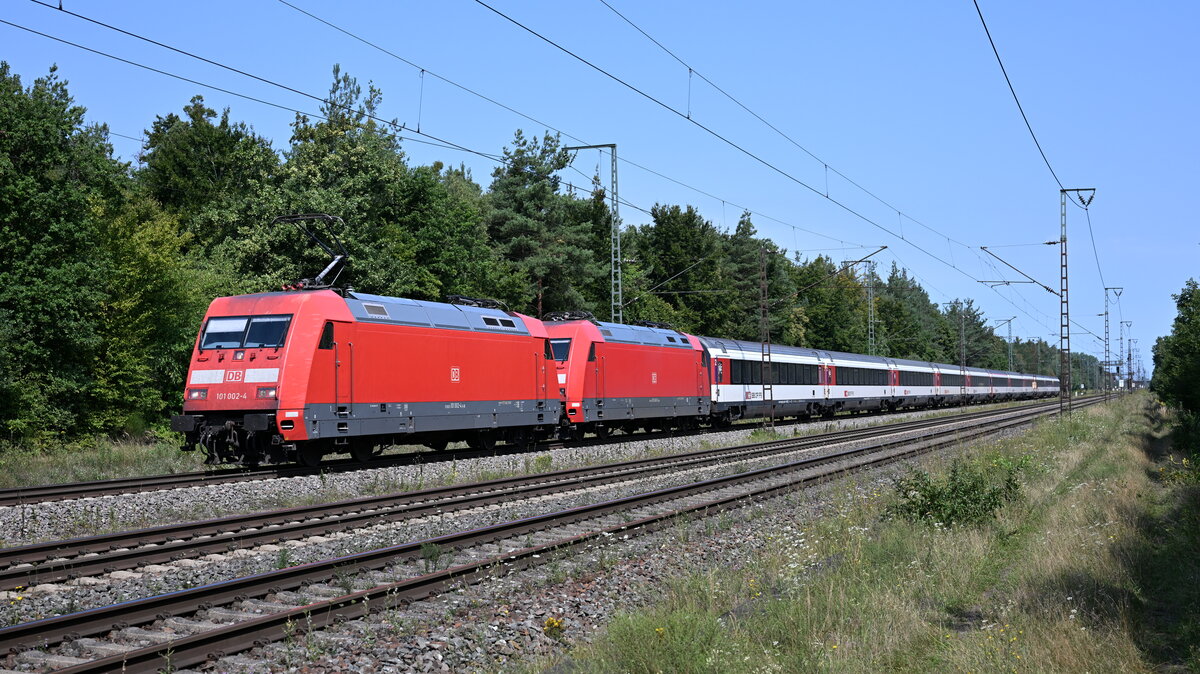 D-DB 218 345-7, D-DB 101 030-5 und D-DB 80-91 115-8 (Bpmmbdzf 286.1) fuhren am 18.08.2025 als IC 2262 zum Ostseebad Binz (WBI). Hier bei der Ausfahrt aus dem Lübecker Hbf (AL).