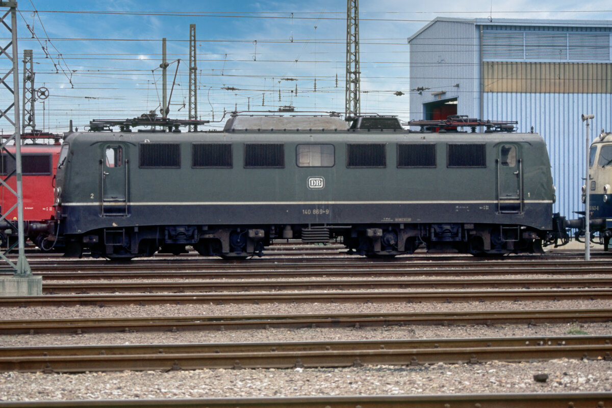 140 875 in grün am 25.04.1993 auf der Fahrt von Mannheim nach Heidelberg bei Mannheim-Friedrichsfeld.