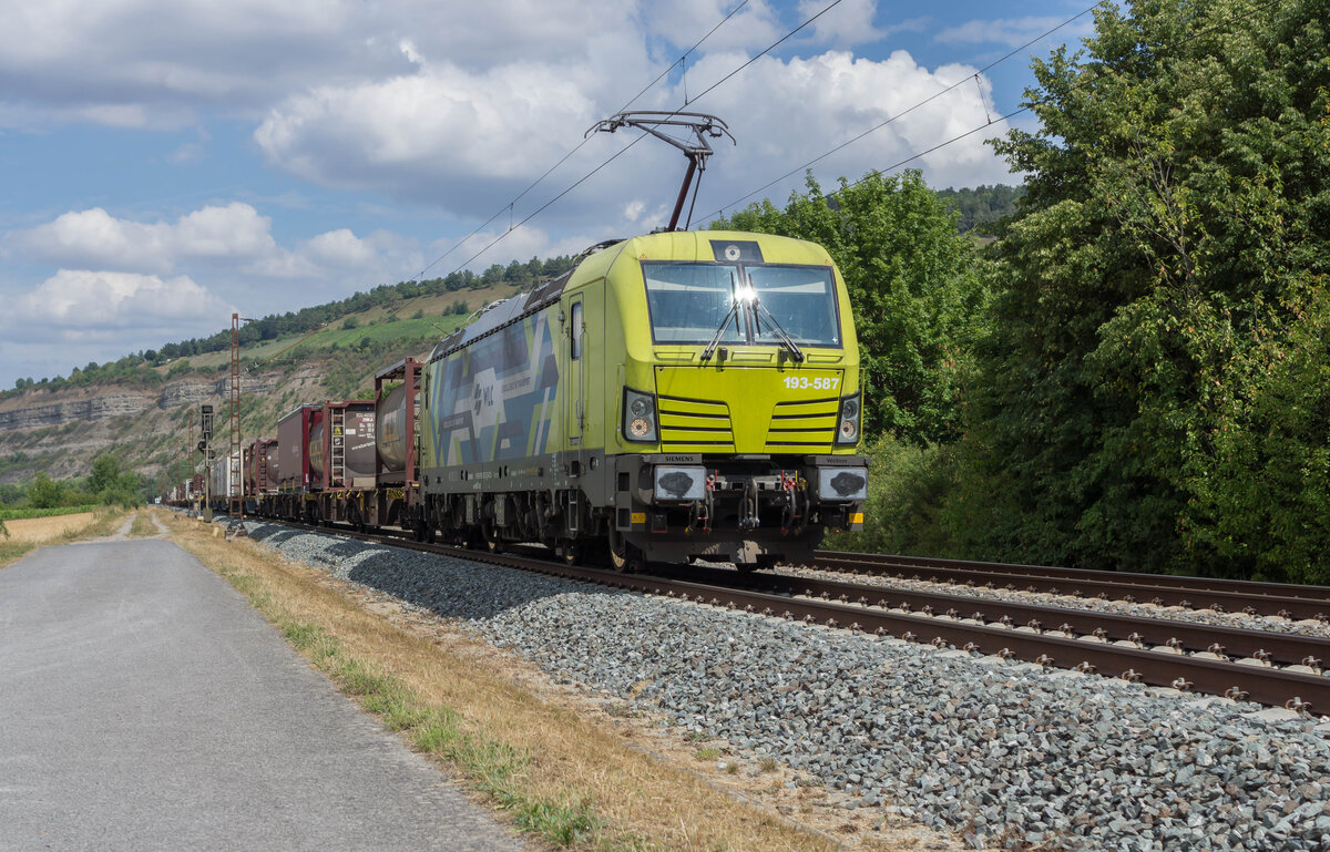 193 587-3 mit einem Aufliegerzug bei Thüngersheim am 10.07.2025.