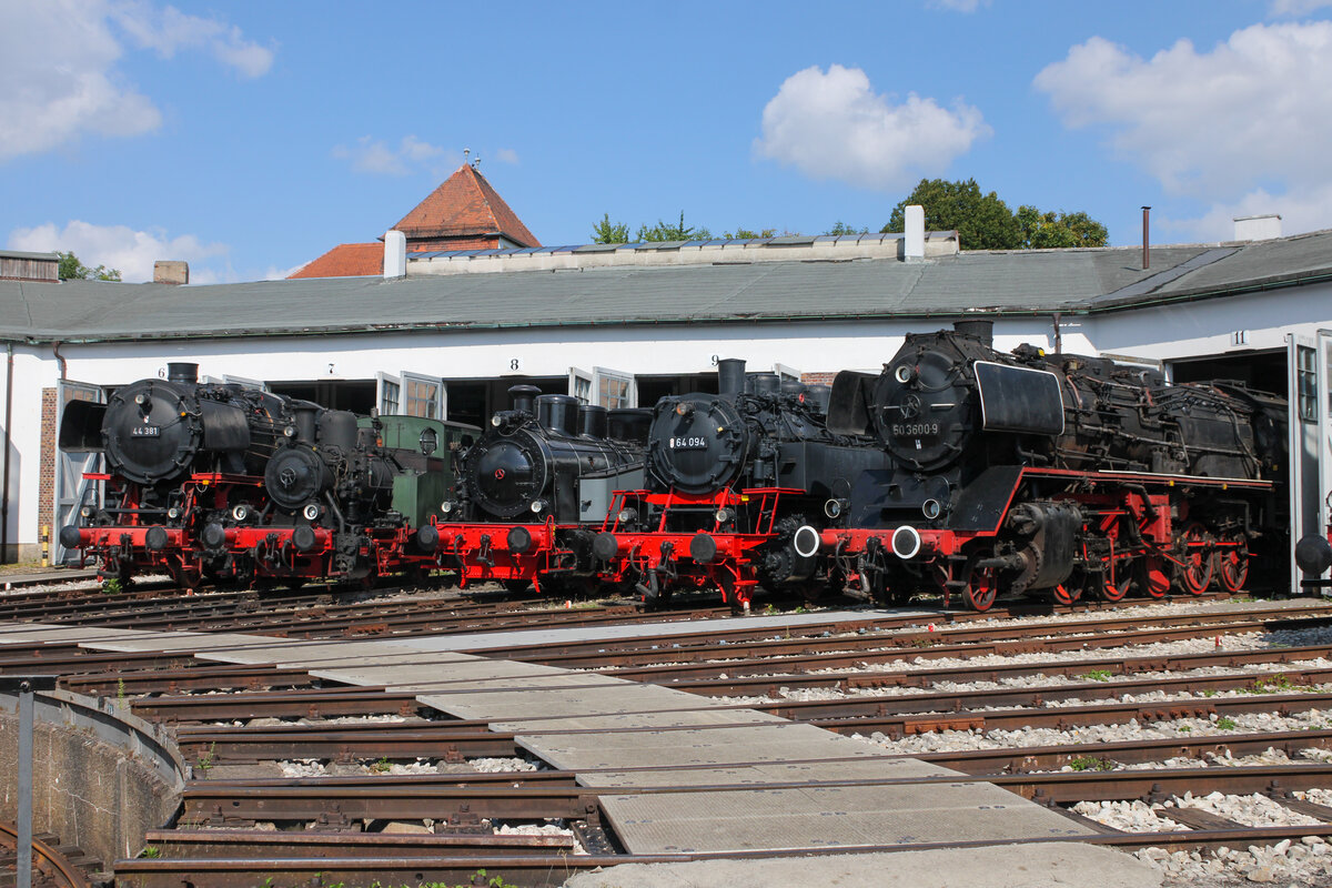 Zahlreiche Dampflokomotiven des BEM Nördlingen stehen am 17.08.2025 vor dem Lokschuppen im Bw Nördlingen, darunter 50 4073, 50 3600 und die Lok „Füssen“.