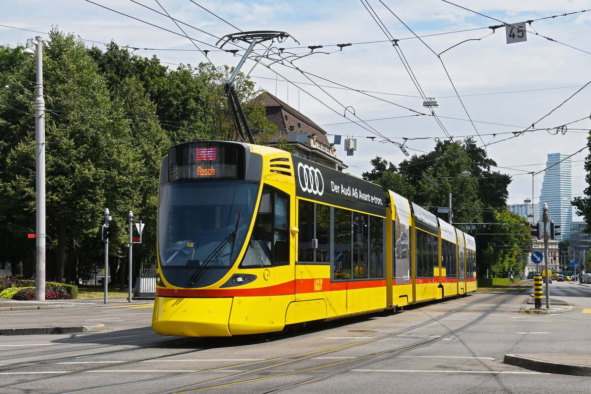 Neu Auflage vom Karaoke Tram. Nach dem ESC Einsatz mit der Ricola Werbung ist der Be 4/6 628 "Drämmli Lounge" erneut im Einsatz. Hier fährt der Wagen zur Haltestelle am Aeschenplatz. Aufnahme Basel.