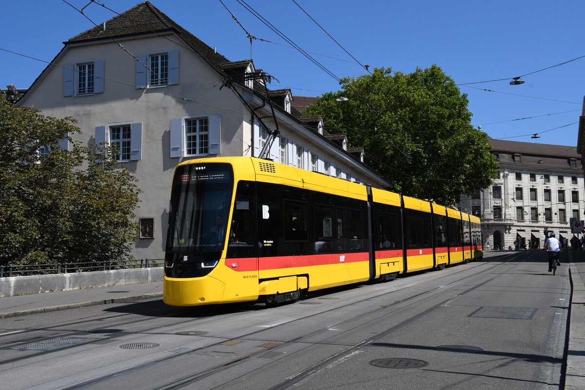 Be 8/10 TINA 4205, auf der Linie 11, fährt am 11.08.2025 den Steinenberg hinunter zur Haltestelle Barfüsserplatz. Aufnahme Basel.