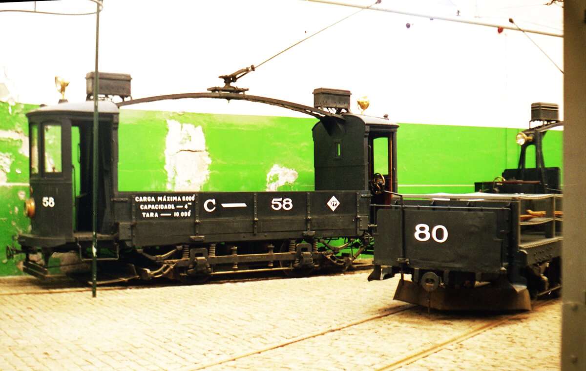 Porto Elétricos__Museu do Carro Eléctrico__ATw C-58 [offener Güter-Tw von 1910, mit urspr. offenen Plattformen; für alle Arten von Gütern, hauptsächlich für den Kohle-Transport ins Kraftwerk Massarelos] und ABw 80 [offener G-Bw hauptsächlich für den Transport von Fischen der Fischhändler die im Tw saßen, vom Hafen Leixões in Matosinhos zu den Märkten in Porto]. __06-2000