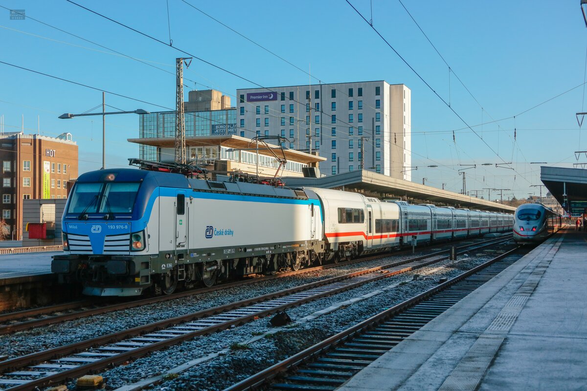 CD 193 976-8 České dráhy "Milos" mit DB ICE-L Talgo (ICE1548 Berlin-Köln) in Essen Hbf, Dezember 2025.