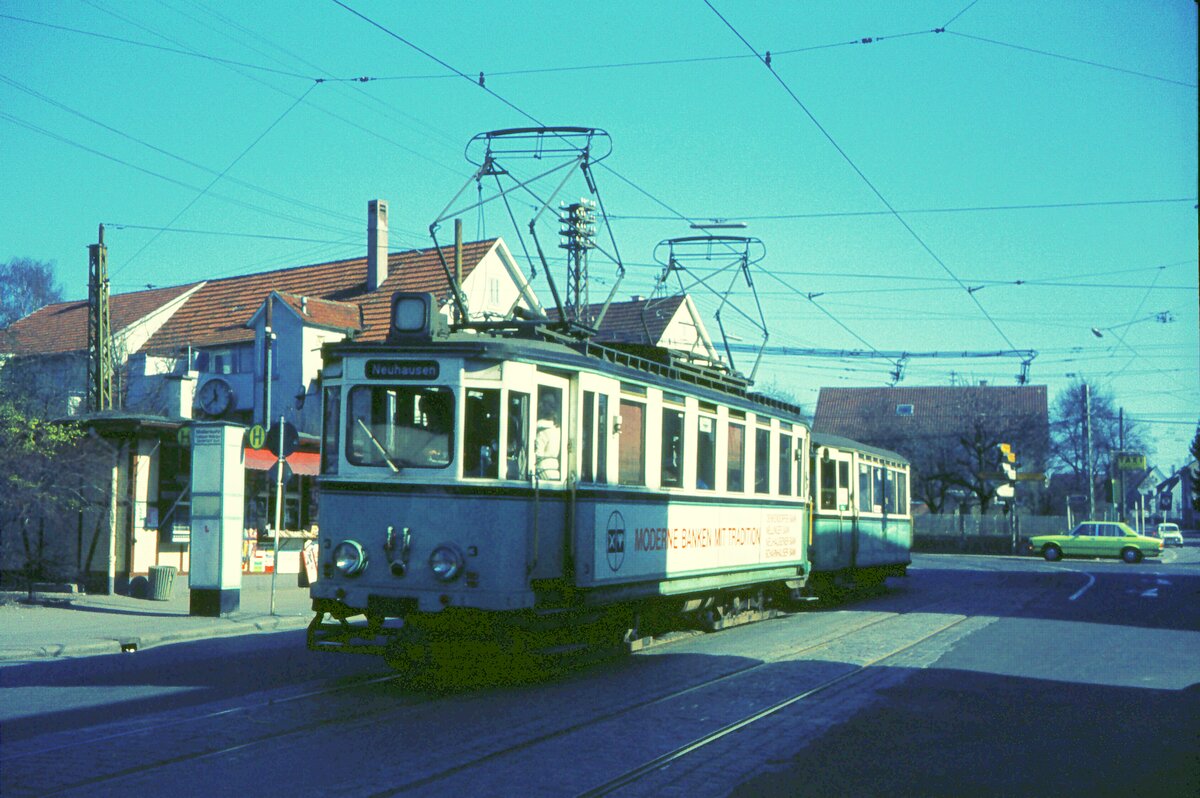 END Straßenbahn Esslingen-Nellingen-Denkendorf__Die aber auch nach Scharnhausen und Neuhausen fuhr.__Tw 3 mit Bw nach Neuhausen an der Haltestelle Nellingen Hindenburgstraße.__04-03-1976