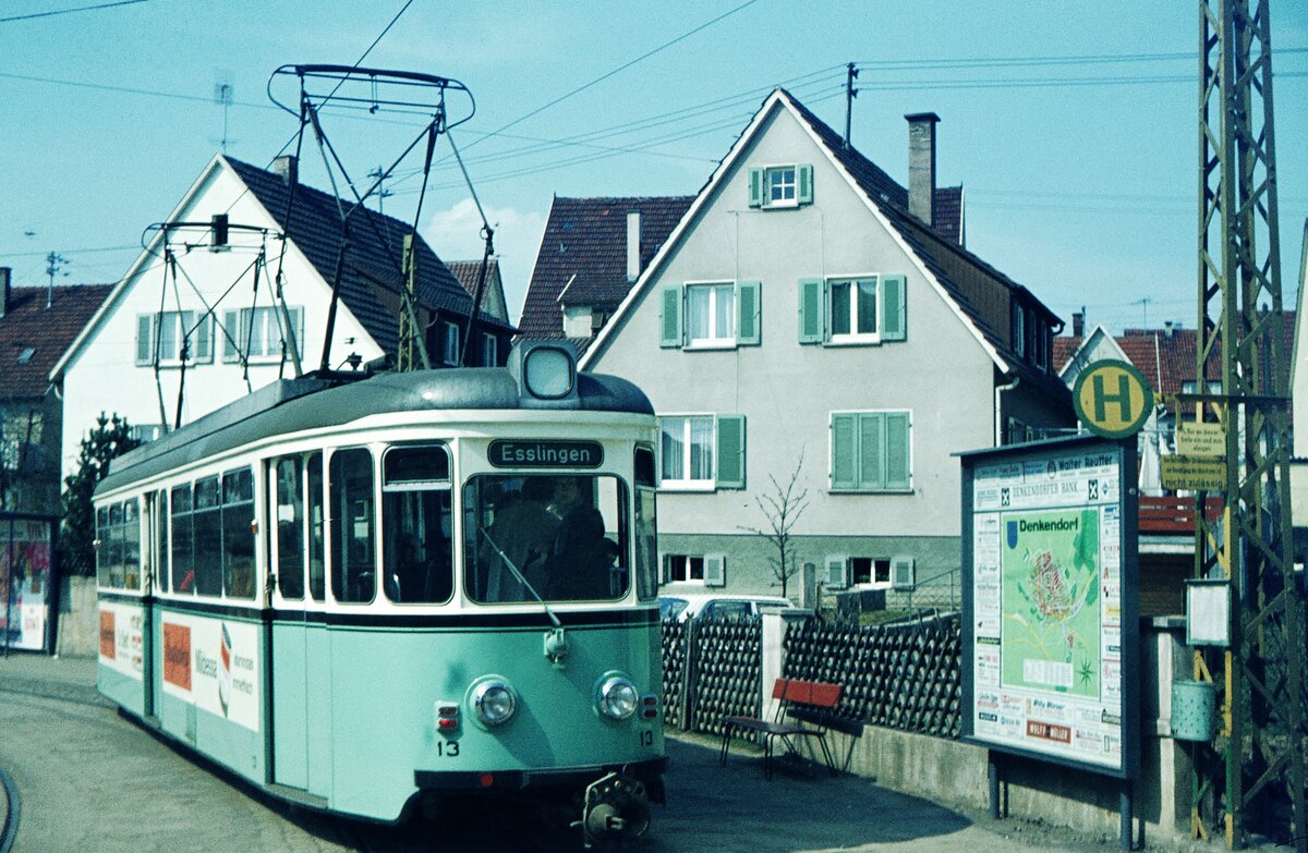 END Straßenbahn Esslingen-Nellingen-Denkendorf__Die aber auch nach Scharnhausen und Neuhausen fuhr.__Die Endstationen Denkendorf und Neuhausen hatten bis zum Schluß keine Wendeschleifen, dort wurde klassisch "umgesetzt". Bild 3 : Tw 13 passiert den Bw 36.__01-04-1976