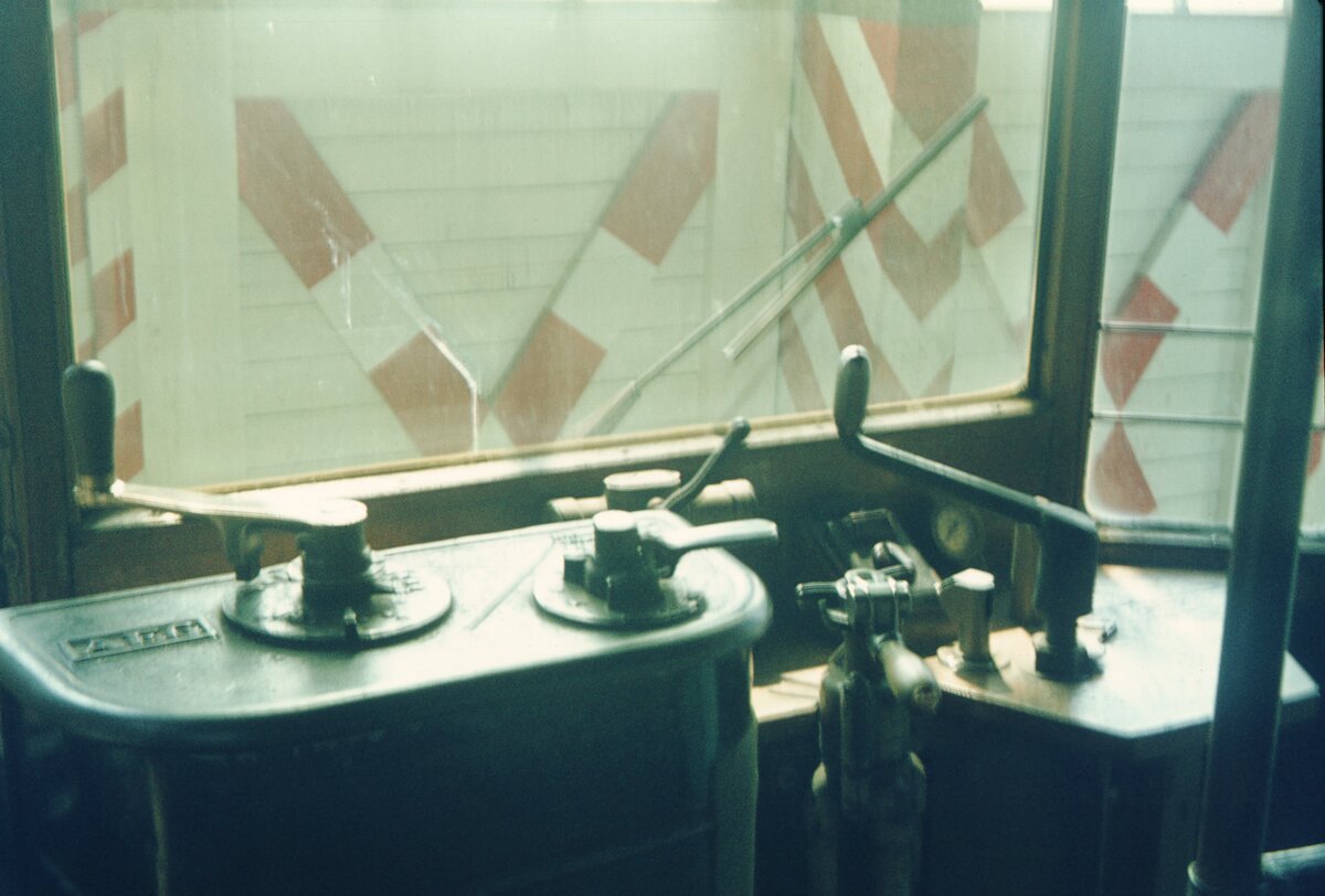 END Straßenbahn Esslingen-Nellingen-Denkendorf__Die aber auch nach Scharnhausen und Neuhausen fuhr.__Führerstand Tw 10 [ME 1942].__SMS in Nellingen: Der Grundstückserwerb für Wagenhalle/Museum gestaltet sich sehr schwierig, die Verhandlungen der Gemeindeverwaltung Ostfildern betreffen kleinste Parzellen von 6 Eigentümern am Ortsrand von Ostfildern, wo auf Wunsch der Gemeinde eine neue Halle errichtet werden soll, weil die bestehenden Wagenhallen abgerissen werden sollen. Im April 1981 läßt die Gemeindeverwaltung die Zufahrtsgleise und -Weichen in der Schillerstr. zuteeren. Das Rangieren der Fahrzeuge gestaltet sich entsprechend sehr umständlich durch Verziehen, Aus und Wieder Auf-Gleisen mit Hilfe von Kettenzügen, Lkw etc. [SMS-RS 2/81]__Foto 09-04-1974