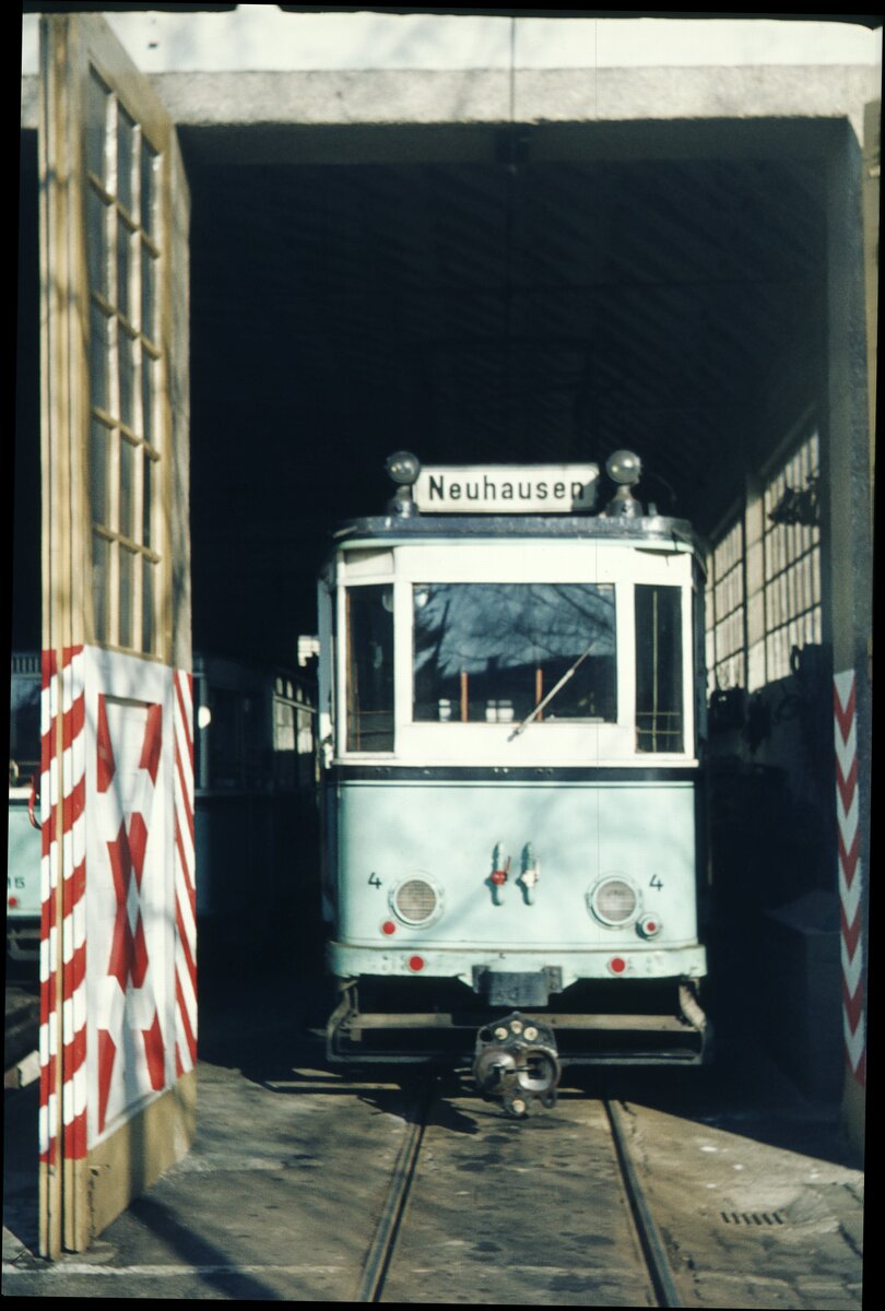 END Straßenbahn Esslingen-Nellingen-Denkendorf__Die aber auch nach Scharnhausen und Neuhausen fuhr.__Tw 4 [ME 1926] als einziger im "beinahe Original-Outlook" verbliebener Tw vor der Halle in Nellingen.__25-02-1978