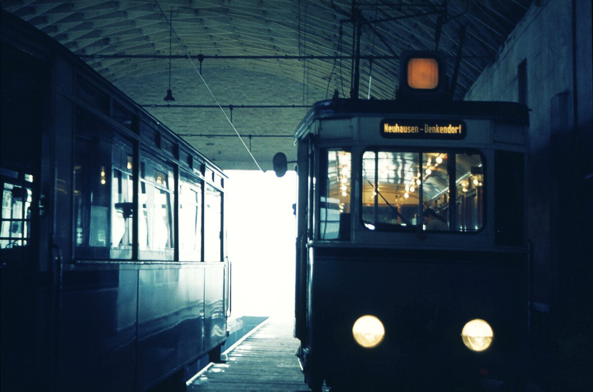 END Straßenbahn Esslingen-Nellingen-Denkendorf__Die aber auch nach Scharnhausen und Neuhausen fuhr.__Neubau-und Alt-Tw in der Wagenhalle. Im Bild zu erkennen die Zollinger-Dach Konstruktion, die heute rund 100 Jahre nach der Patentierung durch ihren Erfinder, den Merseburger Stadtbaumeister Zollinger, ein Come Back erlebt. Beruhend auf einem Stabnetztragwerk, das sich aus vorgefertigten Einzelelementen rautenförmig zusammensetzt, setzte sich diese besonders materialsparende Bauweise in der Notzeit der 1920er Jahre durch, auch weil Bauherren selbst bei der relativ einfachen Montage mithelfen konnten.