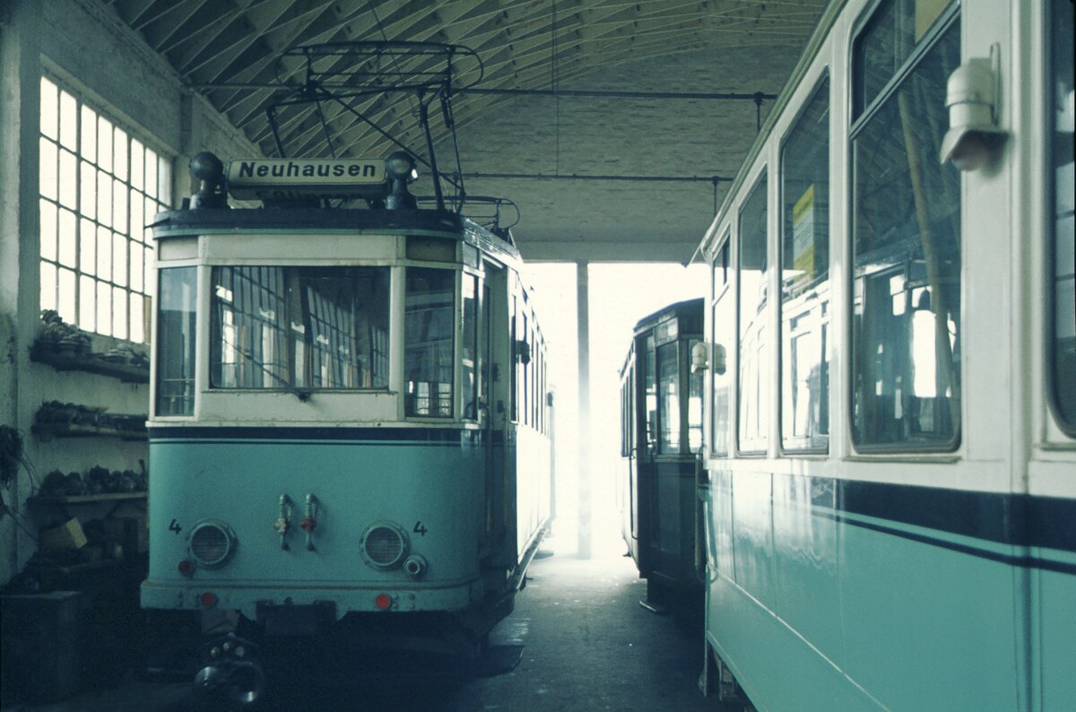 END Straßenbahn Esslingen-Nellingen-Denkendorf__Die aber auch nach Scharnhausen und Neuhausen fuhr.__Tw 4 [ME 1926]__SMS in Nellingen ? Im Frühjahr 1984 war der Auszug aus Nellingen fast abgeschlossen. Fahrzeuge, Werkstatt-u.a.Inventar waren nach Schönau/Odenwald verbracht worden. Dort hat das SMS 1984 auch Grunderwerb getätigt. SMS-Aktive führten noch den Rückbau der Strecke Nellingen Ortsrand bis Körschtal Südrand bis auf das Schotterbett durch (Gleise, Schwellen, inkl. Weichen). Außerdem wurden bis Mai in Nellingen noch HU und Hauptteil der Aufarbeitung des Zb-Bw 120 für das 100-jährige Jubiläum im August 84 durchgeführt. [SMS-RS 2+3/84]__Foto 04-03-1976