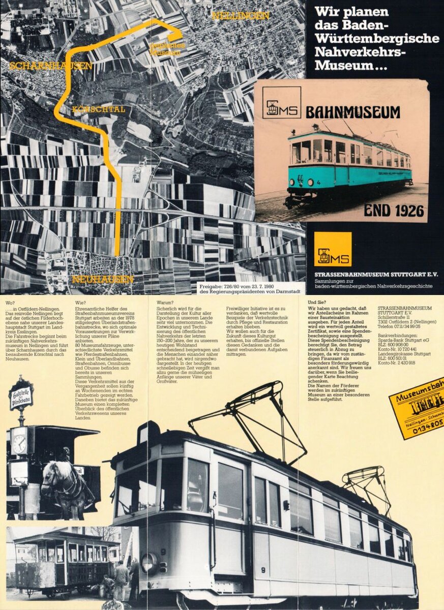 END Straßenbahn Esslingen-Nellingen-Denkendorf__Die aber auch nach Scharnhausen und Neuhausen fuhr.__Die Betriebseinstellung dieser einmaligen Überlandstraßenbahn war dann endgültiger Anstoß für den im Nov. 1976 gegründeten Verein SMS (Straßenbahnmuseum Stuttgart), ein Straßenbahnmuseum zu schaffen und zwar in Nellingen, und zwischen Nellingen und Neuhausen Museumsbetrieb durchzuführen. Ende 1978 hatte das SMS 61 Mitglieder, 1982 waren es 97.
