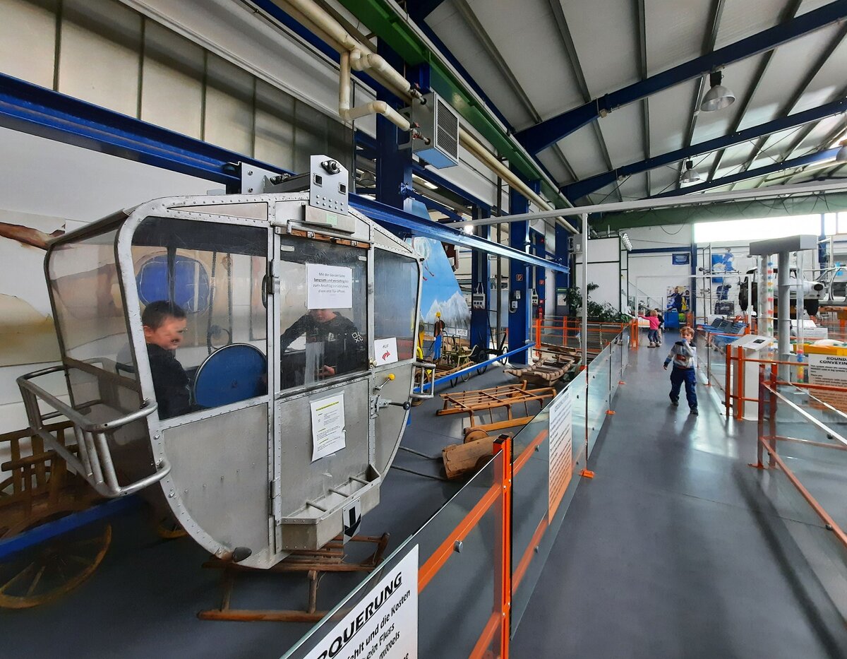 Im Fördertechnikmuseum Sinsheim gibt es diese alte Ski Gondel, die mit eigener Muskelkraft in Betrieb gesetzt werden kann; 16.02.2023.