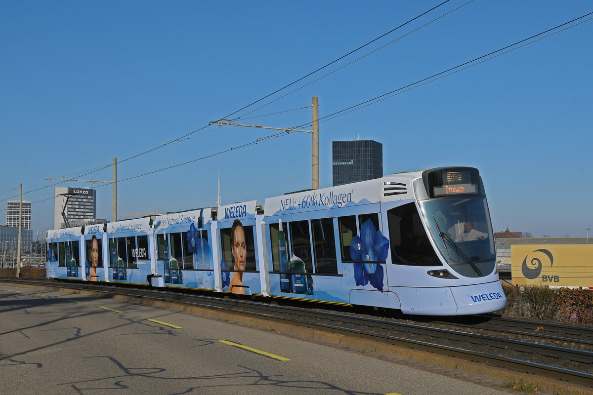 Be 6/10 Tango 182 mit der Weleda Werbung, auf der Linie 10, fährt am 27.12.2024 zur Haltestelle Münchensteinerstrasse. Aufnahme Basel.