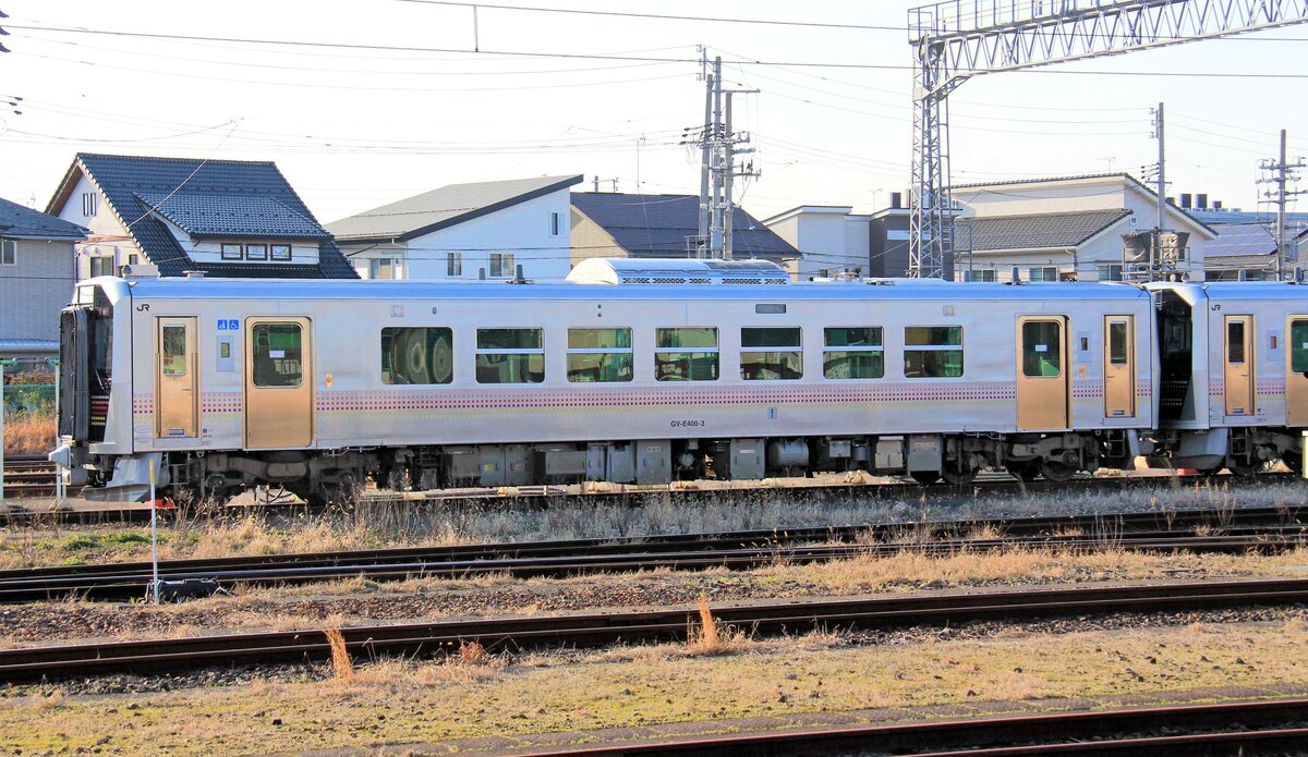 JR East Japan, Serie 400: Zwischen 2018 und 2021 gebaute diesel-elektrische Triebzüge als Ersatz für die noch aus derZeit der Staatsbahn stammenden diesel-hydraulischen Serien 40, 47 und 48 in Nordwest-Japan. Die Züge sind sowohl günstiger als auch leichter als zuerst angedachte Diesel-Hybrid Fahrzeuge. Angeschrieben sind die Wagen als GV-E400 (Grundtyp mit zwei Führerständen), GV-E401 und E402 (Zweiwagenzug, beide Wagen mit nur 1 Führerstand). Das "E" steht für "JR East", das "GV" steht für "Generating Vehicle", d.h. die Dieselmotoren treiben Generatoren für die Elektromotoren an. Es gibt 19 Wagen des Grundtyps Serie 400, und 22 Zweiwagenzüge Serie 401/402. Im Bild steht GV-E400 Nr. 3 in Niitsu, 7. März 2020.