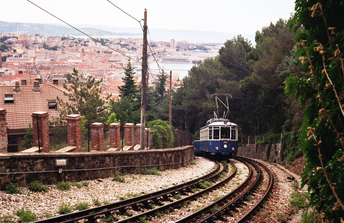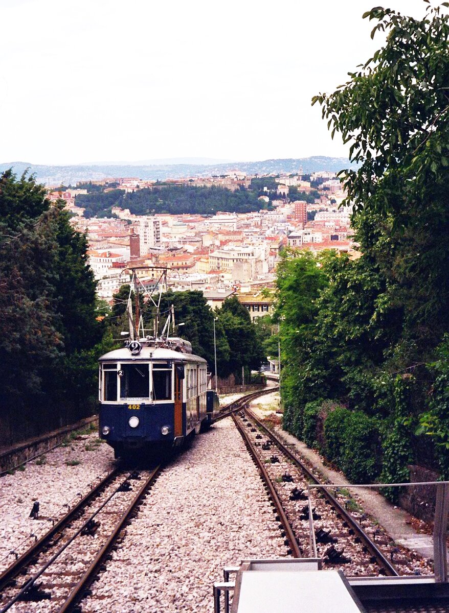 Tram Triest-Opicina__Begegnung am Beginn des zwei-gleisigen Seilbahn-Abschnitts. Tw 402 wird zu Tal gelassen.__08-06-2008