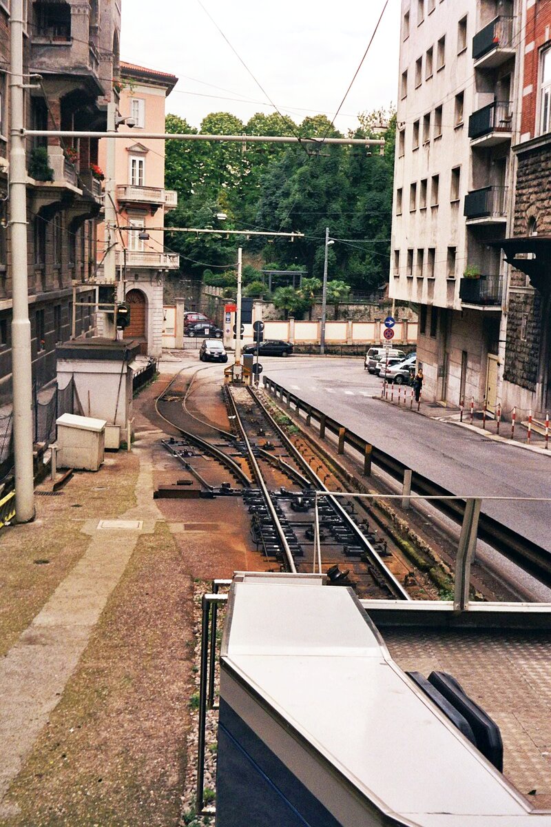 Tram Triest-Opicina__Blick aus dem fahrenden Tw über den Schubwagen auf das talseitige Ende des Seilbahn-Abschnitts.__08-06-2008