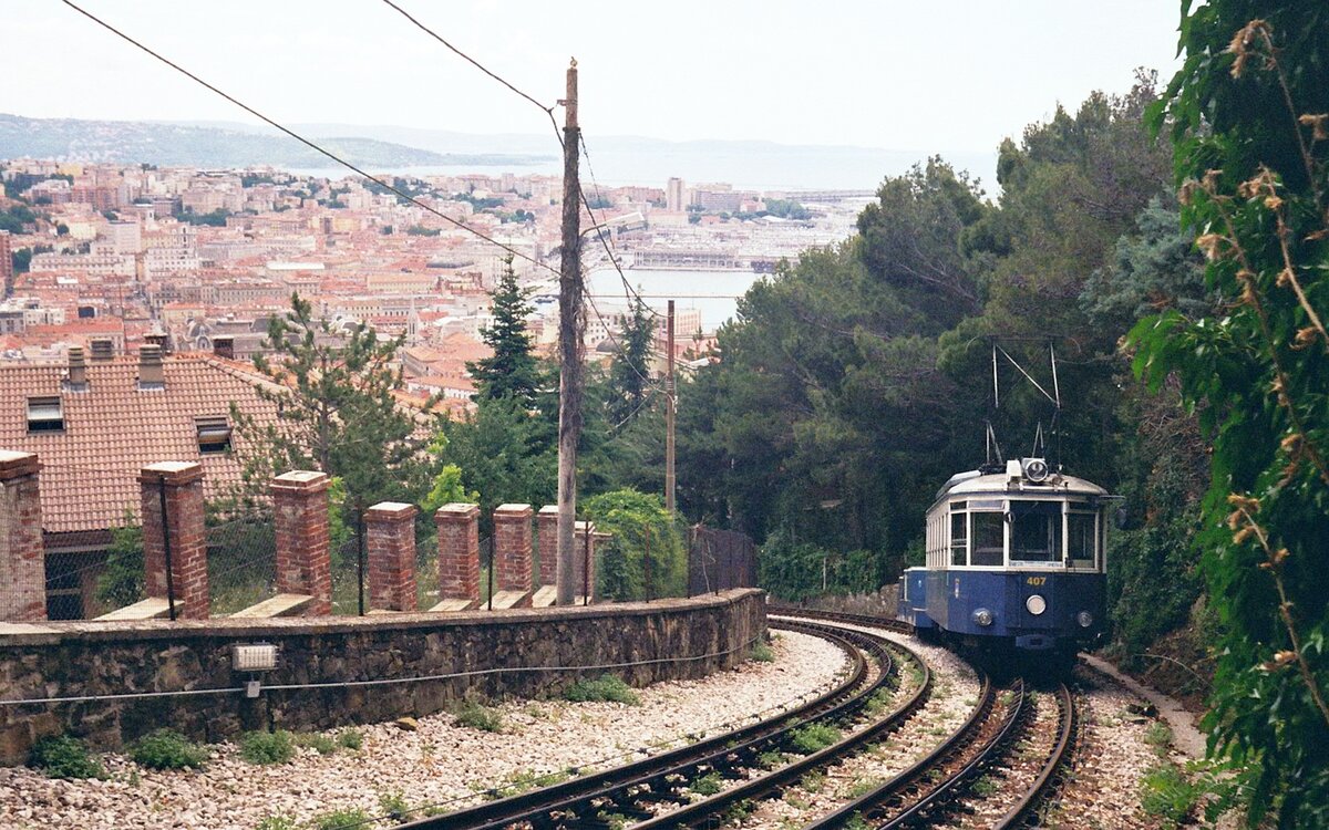 Tram Triest-Opicina__Es geht aufwärts. Schub- und Triebwagen am Beginn der Steilstrecke.__08-06-2008