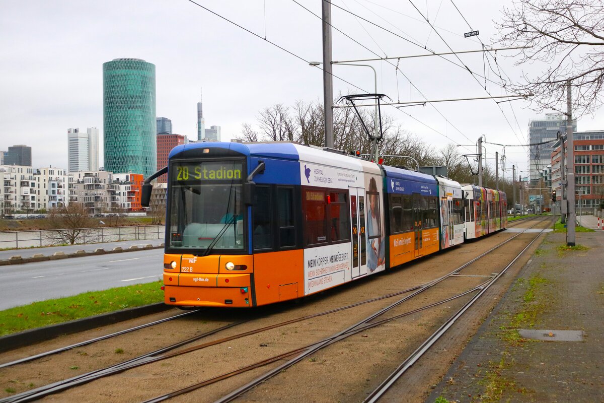 VGF Straßenbahn Frankfurt am Main Bombardier Flexity Classic S-Wagen 222 und 2xx am 21.12.24 als Linie 20