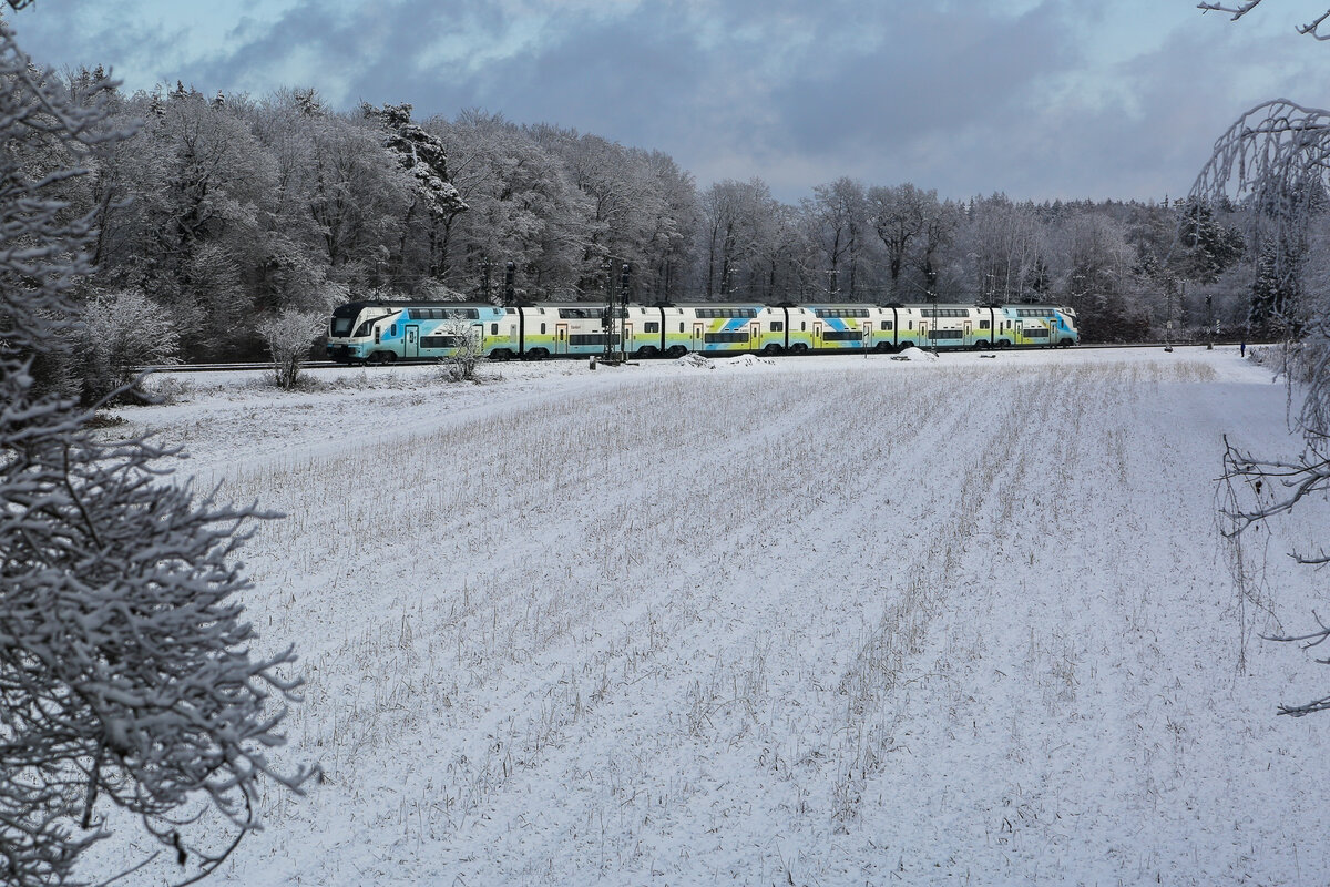 Westbahn auf der Strecke München- Rosenheim am 3.1.25 bei Zorneding in hübscher Winterlandschaft.
