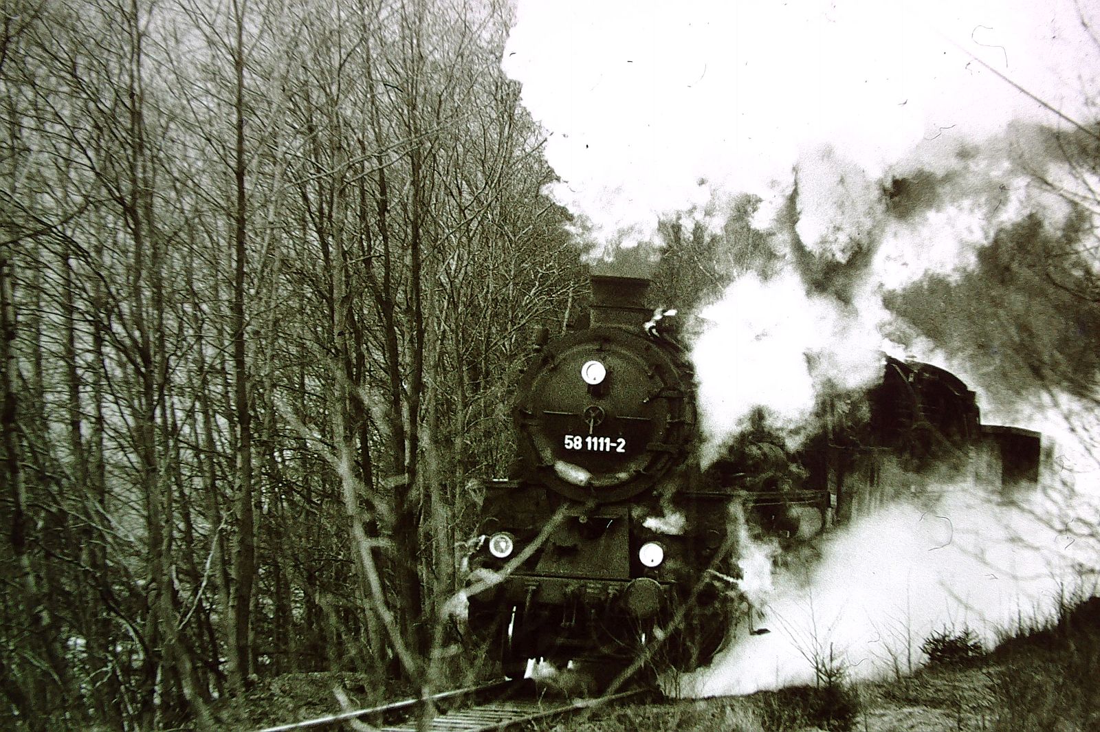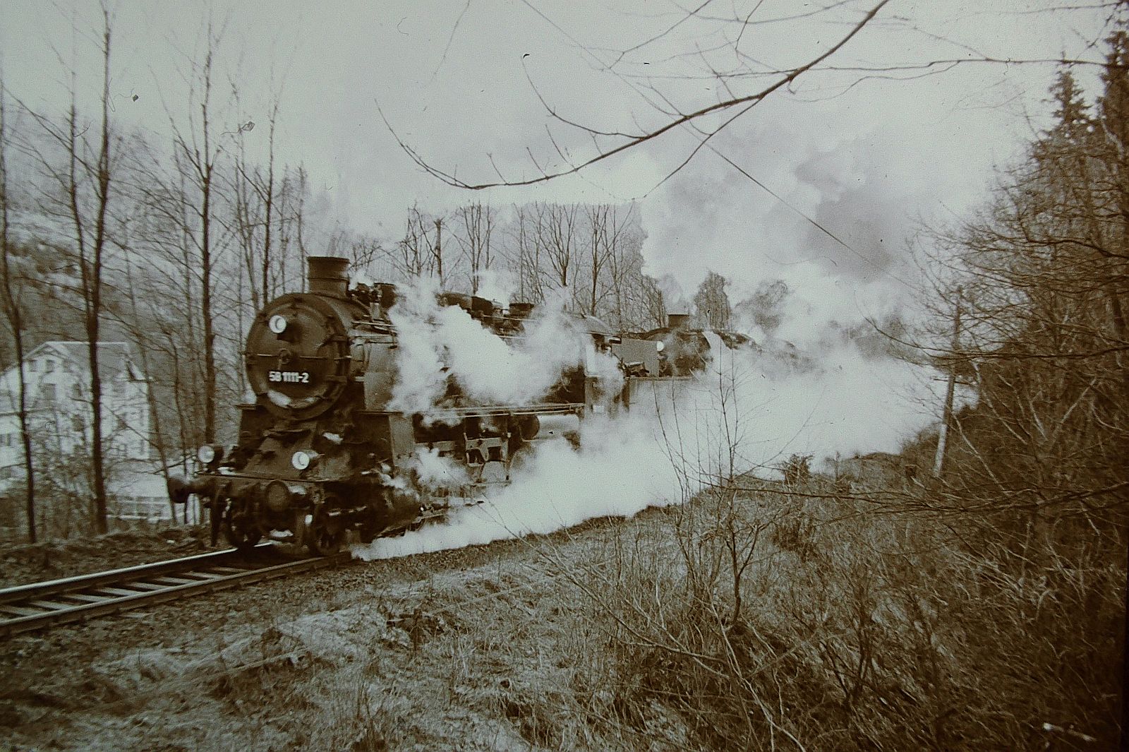 004 (Plandampf im Thüringer Wald Rennsteig & Lobenstein 18.- 21. März 1993 ) Einfahrt Gehlberg Vorspann 58 1111-2 mit 44 1093-2 mit Dg 55613 von Arnstadt nach Meiningen S-W aufnahme mit Agfa 100 Iso Kamera Minolta X 300-s