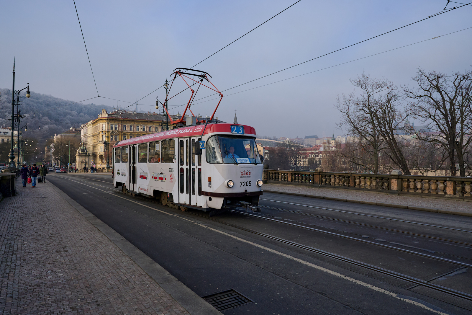 T3SUCS 7205 der Prager Verkehrsbetriebe macht für das Straßenbahnmuseum Werbung. Am 28.12.2024 war der Wagen auf der historischen Linie 23 in Richtung Zvonařka unterwegs und überquerte die Brücke der Legionen.