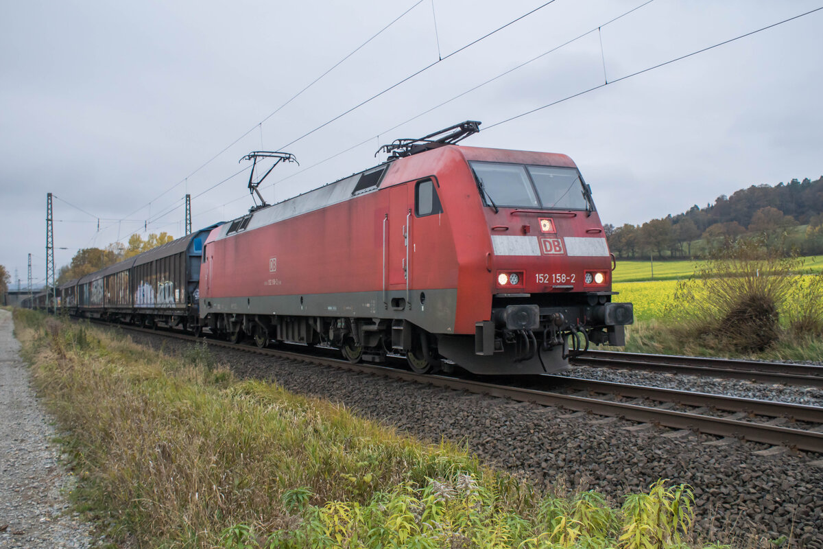 152 158-2 mit einem gemischten Güterzug am 13.11.2024 bei Kerzell.