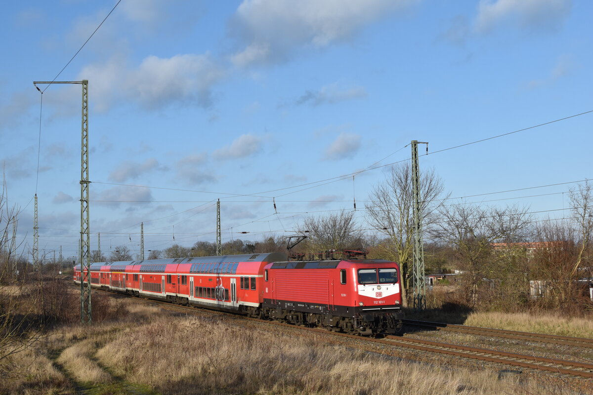 DB Regio AG - Region Nordost, Fahrzeugnutzer: Regionalbereich Berlin/Brandenburg, Potsdam mit ihrer "112 110" (NVR: "91 80 6112 110-2 D-DB") und dem RE 4 bei der Einfahrt im Bahnhof Falkenberg (Elster), 08.01.25