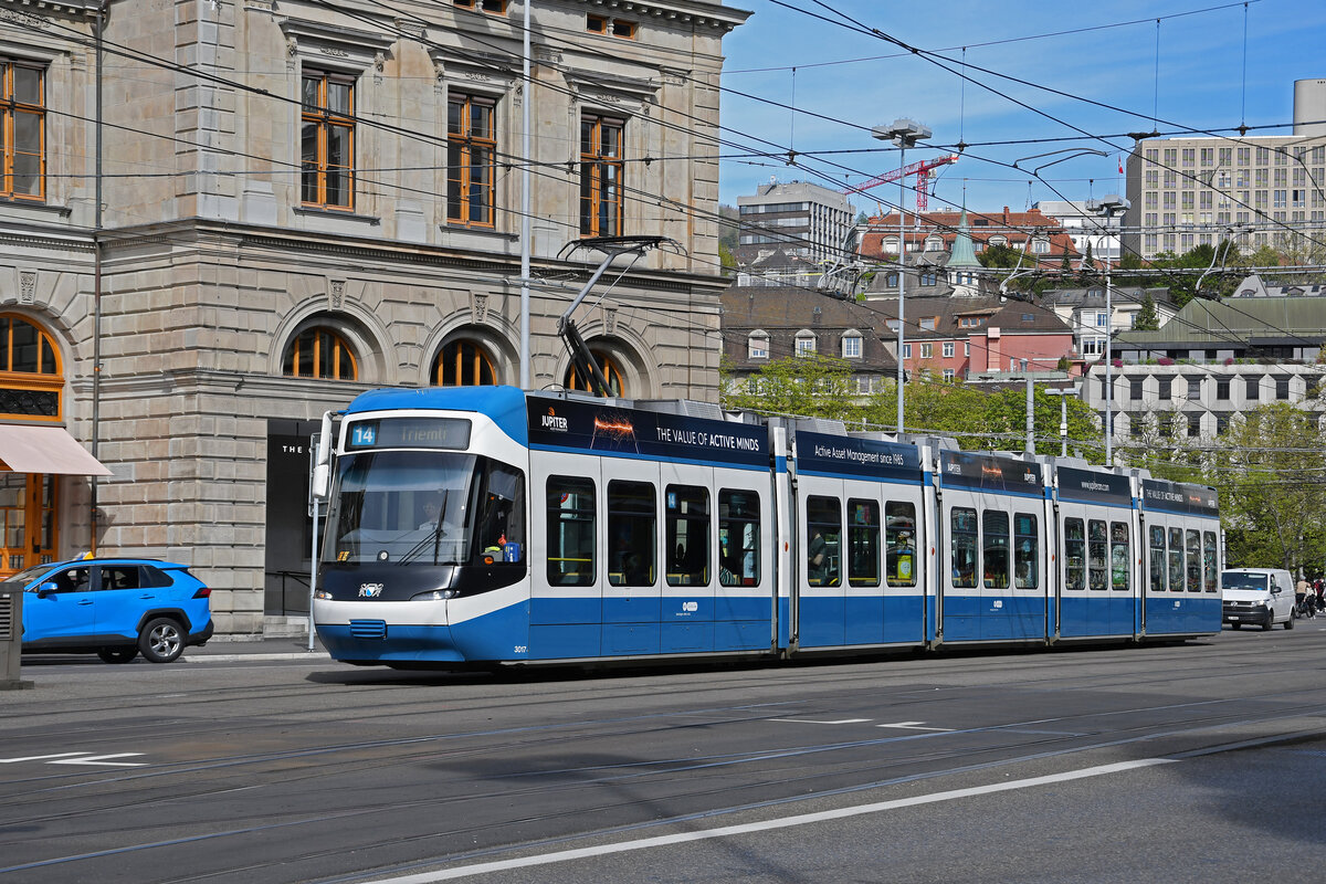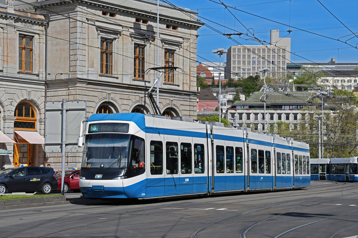 Be 5/6 Cobra 3004, auf der Linie 3, fährt am 12.04.2024 zur Haltestelle beim Bahnhofplatz in Zürich.