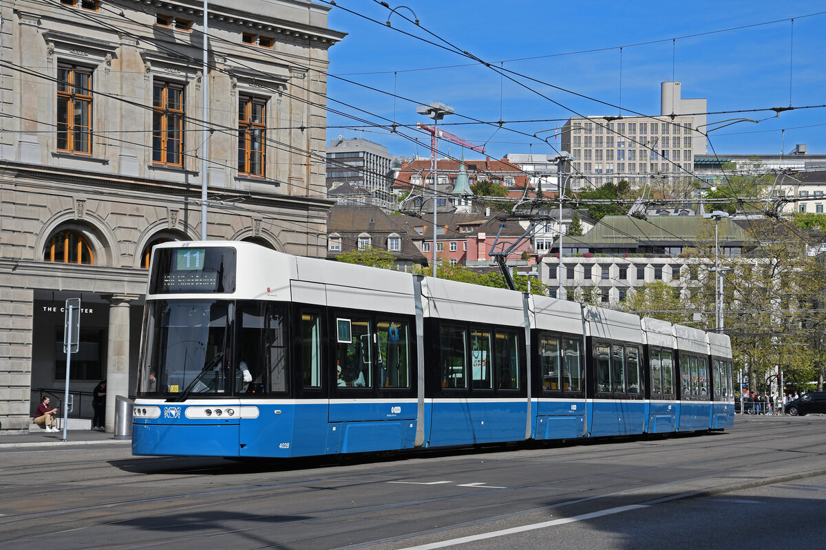 Be 6/8 Flexity 4028, auf der Linie 11, fährt am 12.04.2024 zur Haltestelle beim Bahnhofplatz in Zürich.