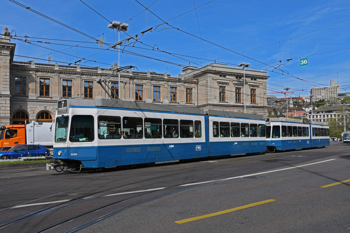 Doppeltraktion, mit den Be 4/6 2096 und 2066, auf der Linie 7, fährt am 12.04.2024 zur Haltestelle beim Bahnhofplatz in Zürich.