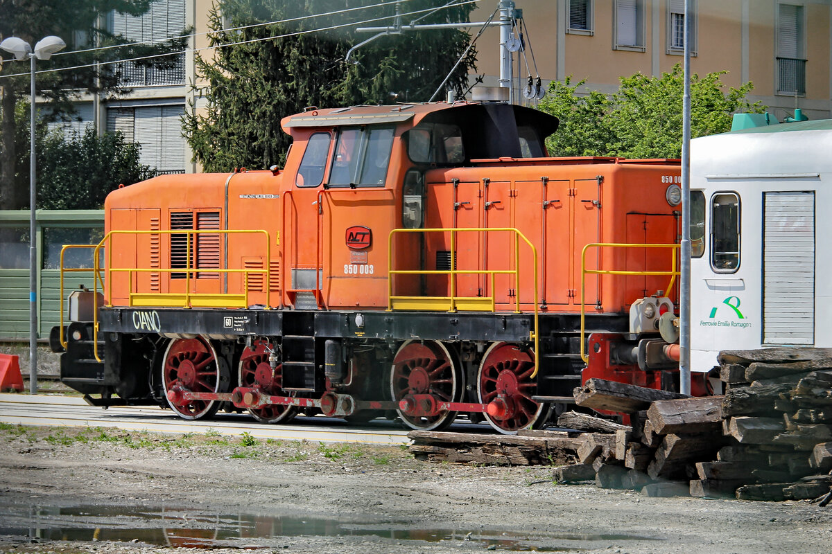 In Italien/Reggio Emilia entdeckt: Die von Henschel 1958 an die Söhrebahn (V 4) gelieferte diesel-hydrauliche Lok (Bauart DH 850 D) kam nach Übernahme des Betriebs an die DB und erhielt dort 1970 die Nummer 279 001-2, bevor sie schon ein Jahr später weiterverkauft wurde und letztendlich in Italien bei der ACT unter der Nummer 850 003 landete (Aufnahme dort am 23.04.2019). Die für diese Sonderbauart korrekten Kategorien folgen.
