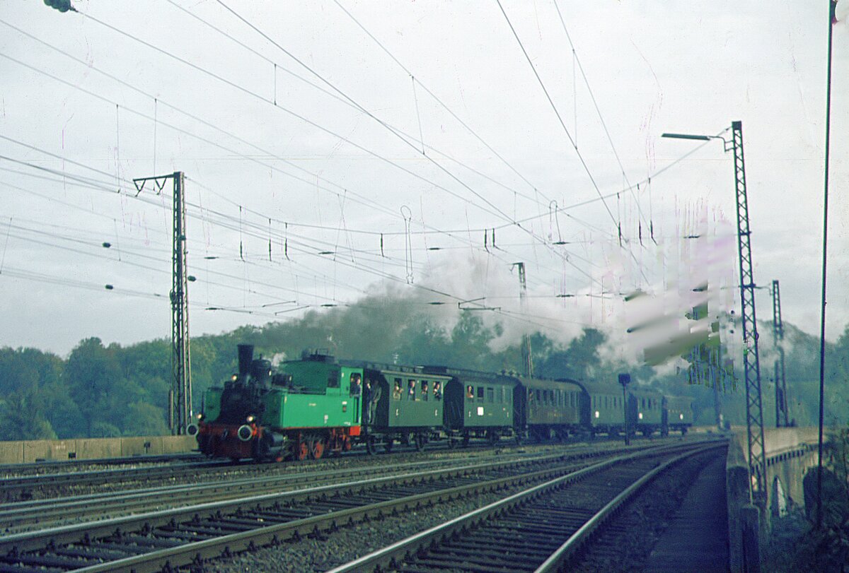 Shuttle-Service zw. Hbf Stuttgart und AW Cannstatt zum Tag der Offenen Tür. Begegnung des Dampfzugs mit Lok 30 [Borsig 1904 als Baulok für Strecke Biberach-Oberharmersbach, ... 1955 Kandertalbahn, 1966 EUROVAPOR, Kandertalbahn]. Begegnung mit E10-geführtem Zug auf der Rosensteinbrücke.__24-10-1970