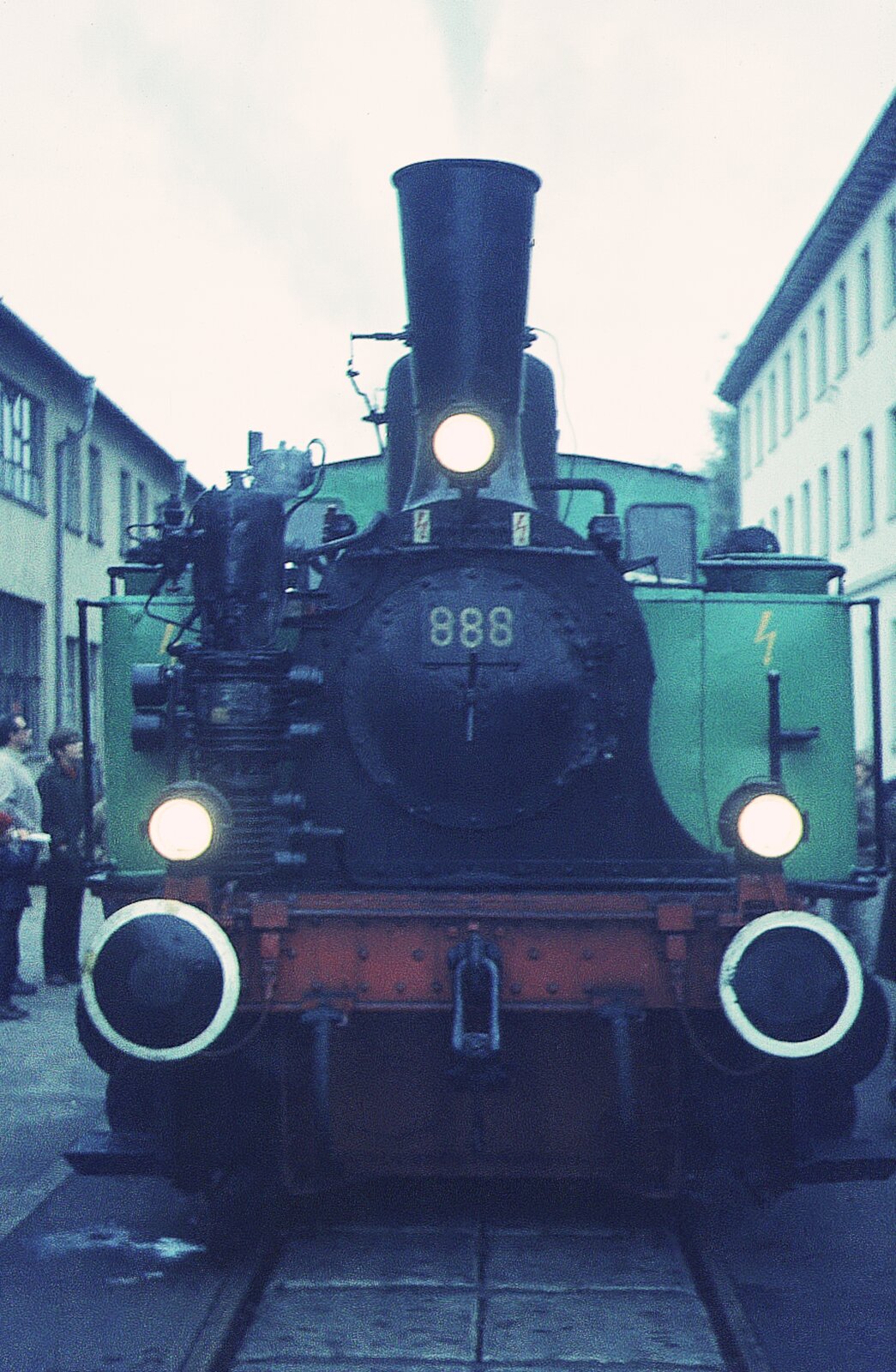 Shuttle-Service zw. Hbf Stuttgart und AW Cannstatt zum Tag der Offenen Tür. Lok 888 [württ.T 3; Maschinenbaugesellschaft Heilbronn 1912] die nach ihrem Dienst auf der K.W.ST.E über zahlreiche Zwischenstationen als 89 407 (BW Friedrichshafen, Bw Rosenstein, WN, Gaswerk Stuttgart, EUROVAPOR, Denkmallok im Gaswerk, im Süddeutschen Eisenbahnmuseum Heilbronn (SEH) landete, dessen Zukunft aktuell auch unklar zu sein scheint...) im Gelände des AW.__24-10-1970