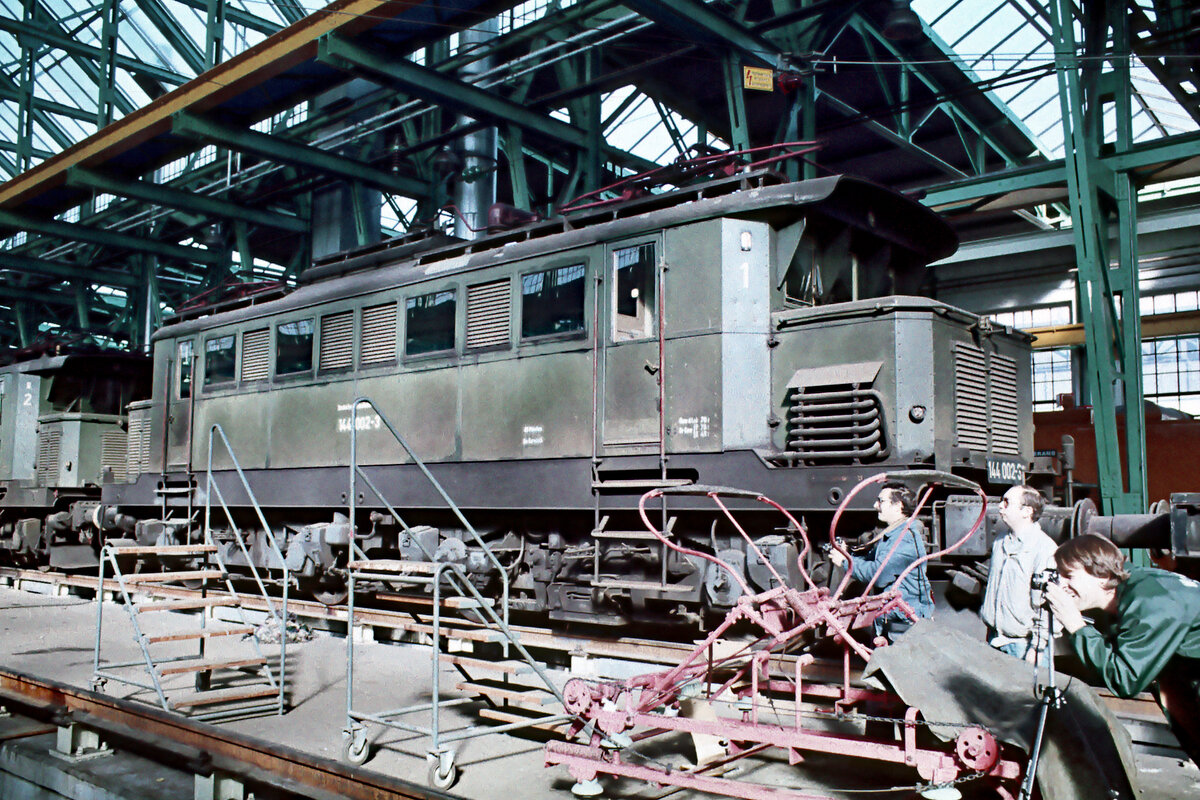 Die 1978 ausgesonderte 144 001 am 31.10.1984, jetzt als Museumslok, im Aw. München-Freimann.