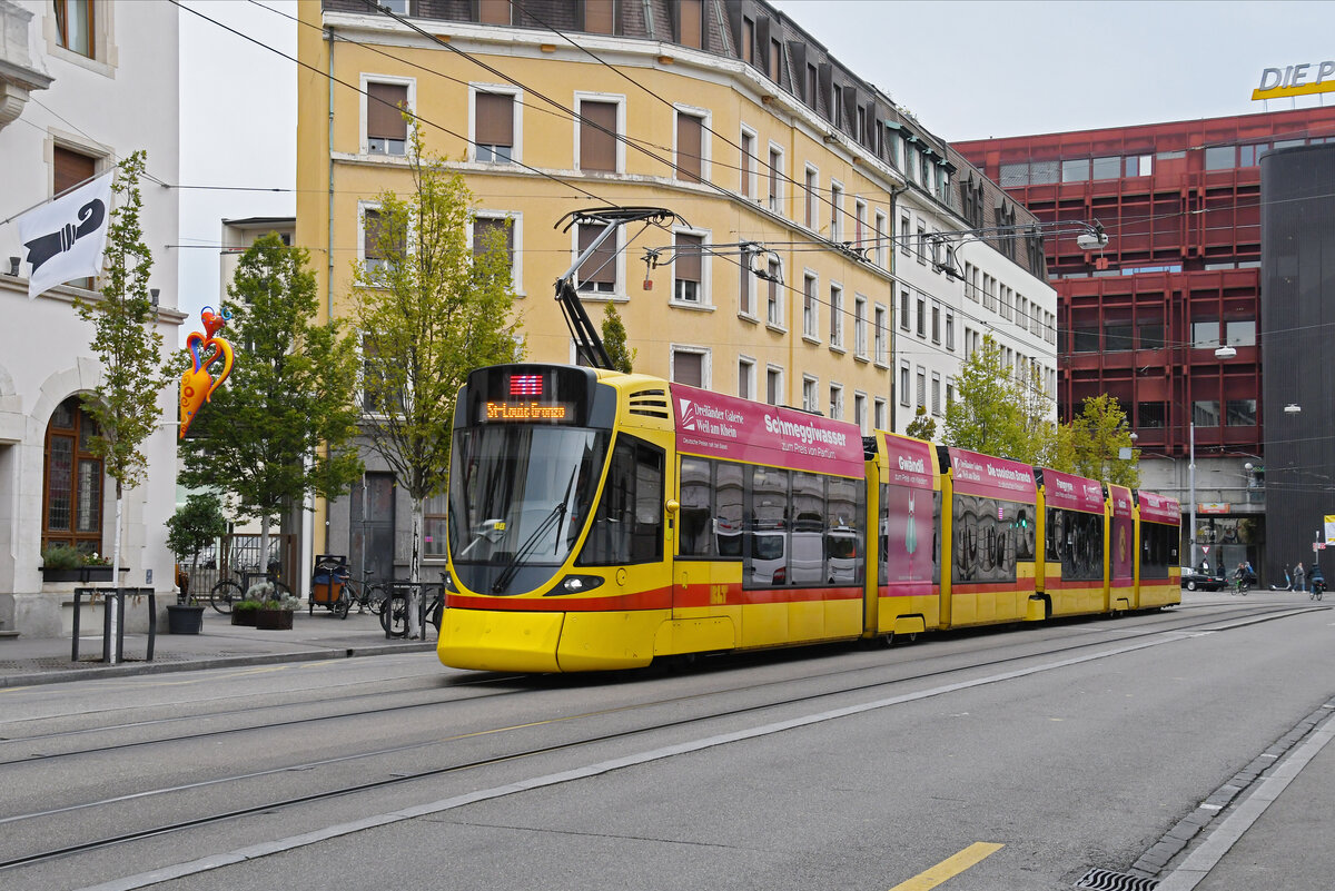 Doppeltraktion, mit dem Be 4/8 259 im BTB Look zusammen mit dem Be 4/6 229, auf der Linie 10, fährt am 16.09.2024 zur Haltestelle am Bahnhof SBB. Aufnahme Basel.