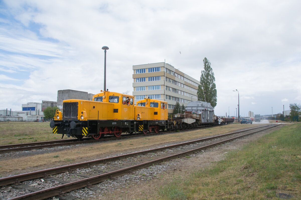 Die beiden Werkloks EWN GmbH Greiswald Lok1 und Lok2 rangieren einen Transformator, vom Bahnhof Lubmin, über das alte KKW Greifswald (Lubmin) zum Umspannwerk. Im Hintergrund sieht man einen zurückgebauten Reaktor des Kraftwerkes. 12.05.2020