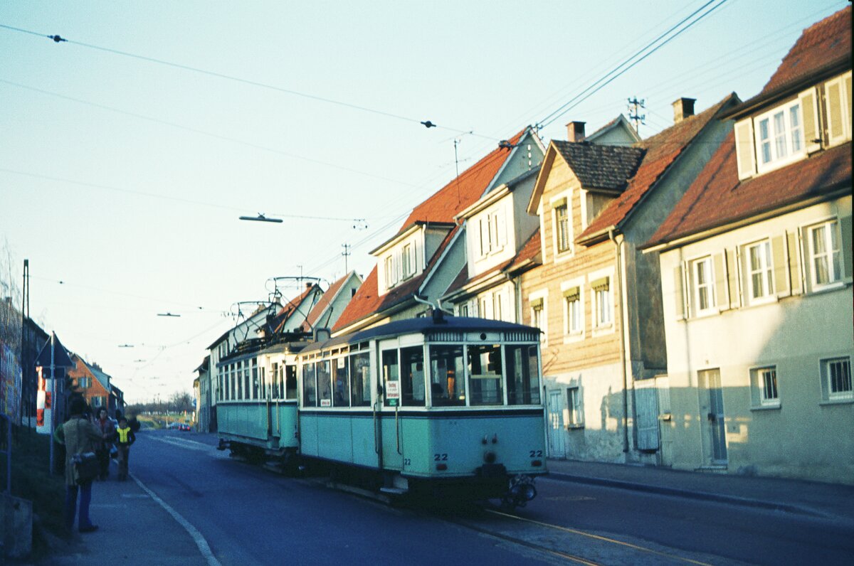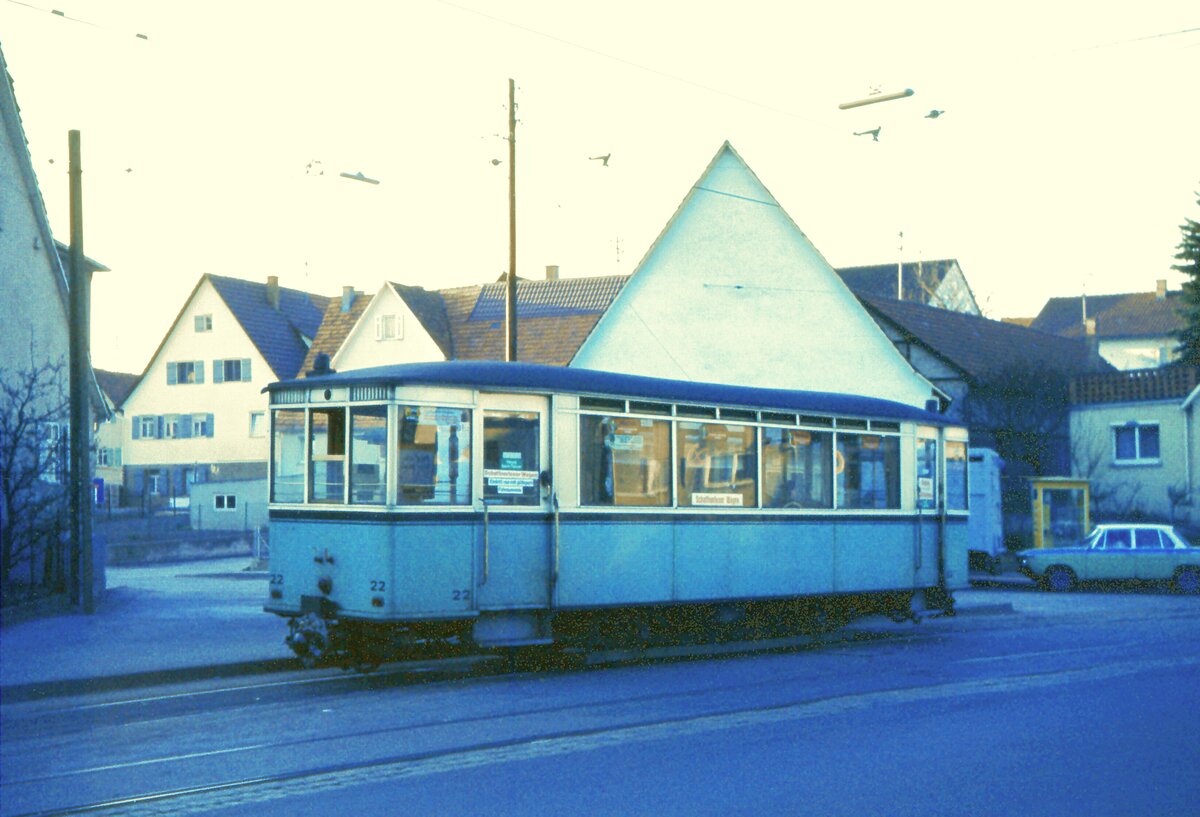 END Straßenbahn Esslingen-Nellingen-Denkendorf__Die aber auch nach Scharnhausen und Neuhausen fuhr. 2-Wagenzug mit Bw 22 fährt aus Neuhausen hinaus.__01-04-1976