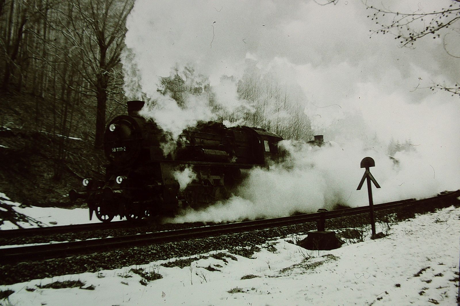 058 (Plandampf im Thüringer Wald Rennsteig & Lobenstein 18.- 21. März 1993 ) Abfahrt Dg 55613 Arnstadt-Meiningen Vorspann 58 1111-2 und Zuglok 44 1093-2 im Bahnhof Gehlberg aufnahme S-W mit Agfa Iso Kamera Minolta X-300