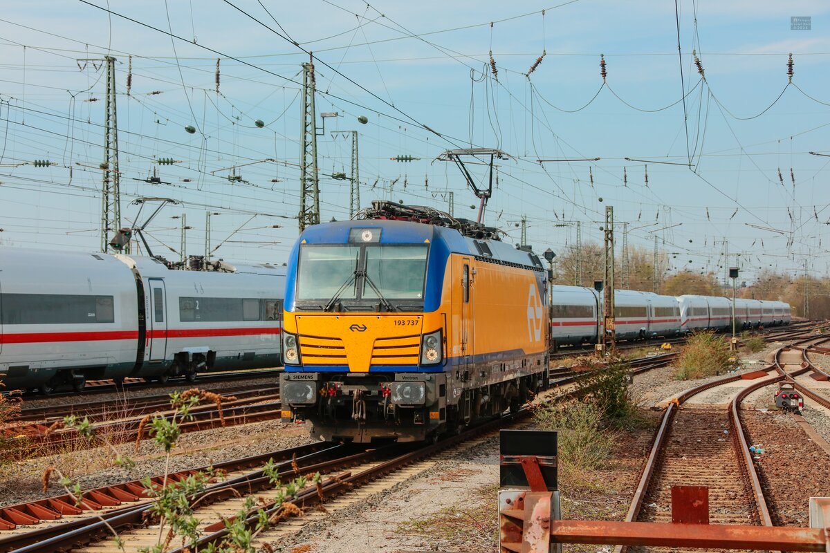 193 737 & DB ICE4 bei der Einfahrt in Hamm Hbf, April 2025.