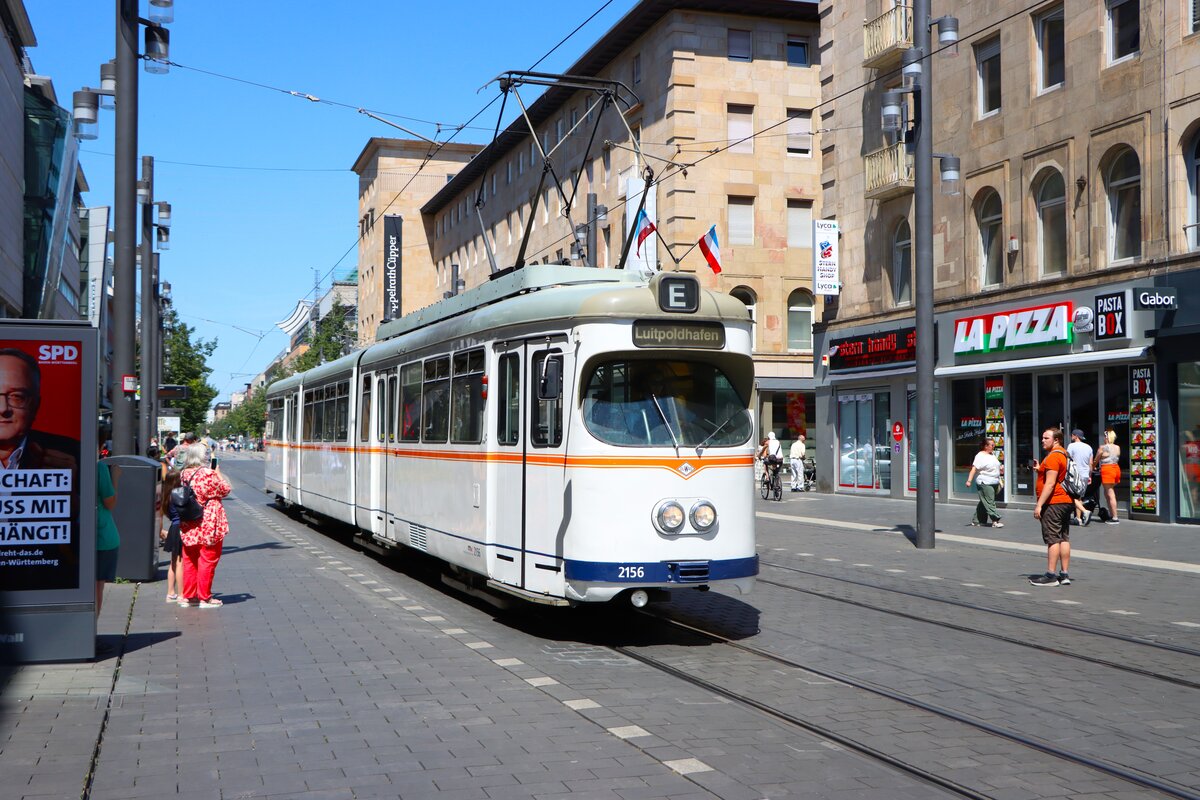 Düwag GT8 Wagen 2156 bei der RNV Straßenbahnparade 125 Jahre elektrische Straßenbahn in Mannheim am 29.06.25 in der Innenstadt