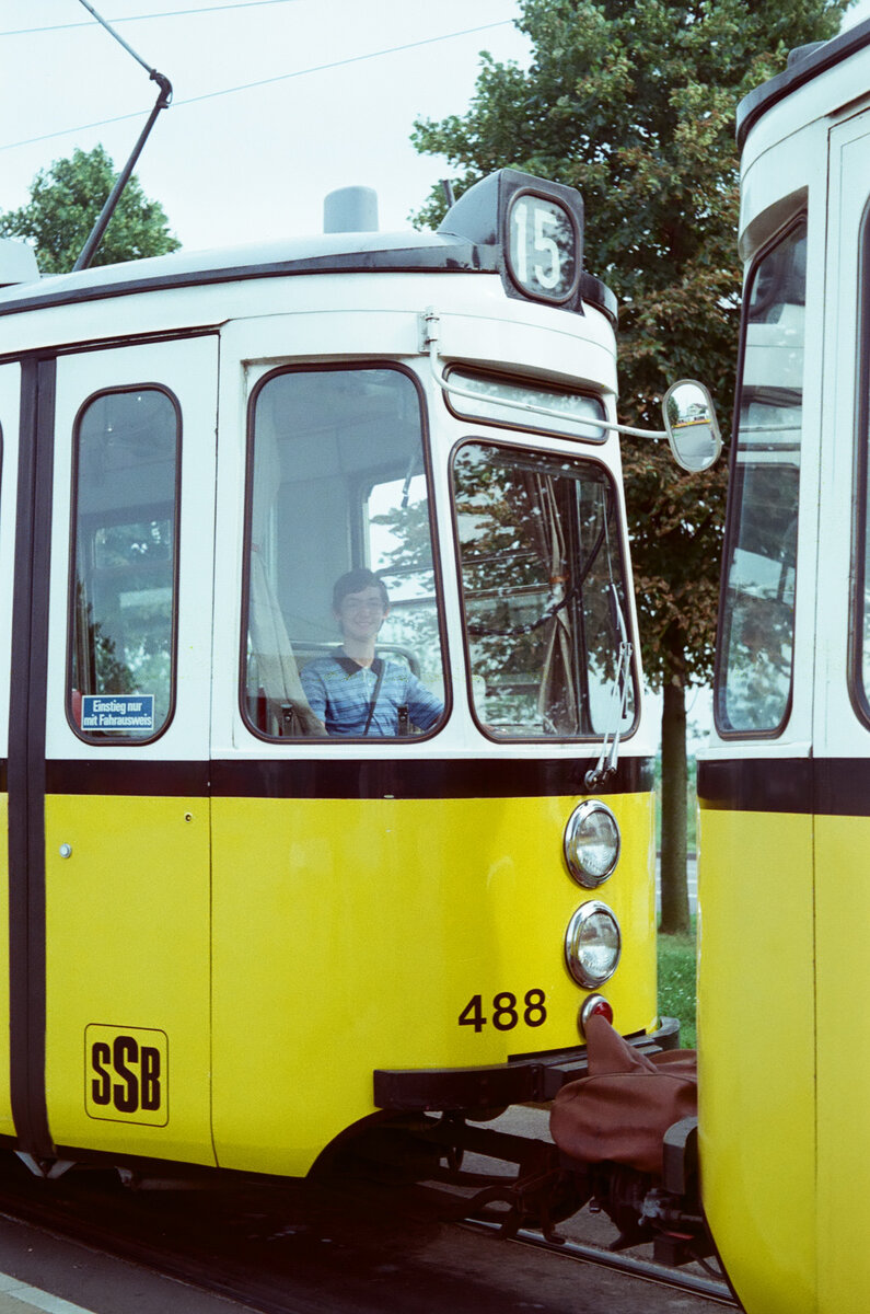 Ein frühes Hobby von mir bestand darin, Stuttgarter Straßenbahnzüge aufzuspüren, bei welchen der Beiwagen einen frei zugänglichen und benutzbaren Fahrersitz hatte und mit einem solchen Zug sozusagen als Fahrer von Heumaden zur Stuttgarter City zu fahren (das war natürlich verboten!). Ich saß hier auf einem solchen Fahrersitz (die Aufnahme war nur mit Stativ möglich). Der Zug der Straßenbahnlinie 15 befand sich in der Straßenbahnschleife Heumaden. Die Aufnahme ist von 1983