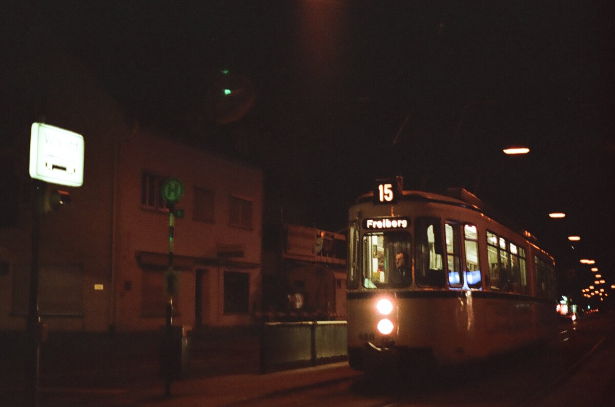 Ein Nachtzug der Stuttgarter Straßenbahnlinie 15 bei der Station Eduard-Steinle-Straße (1983)